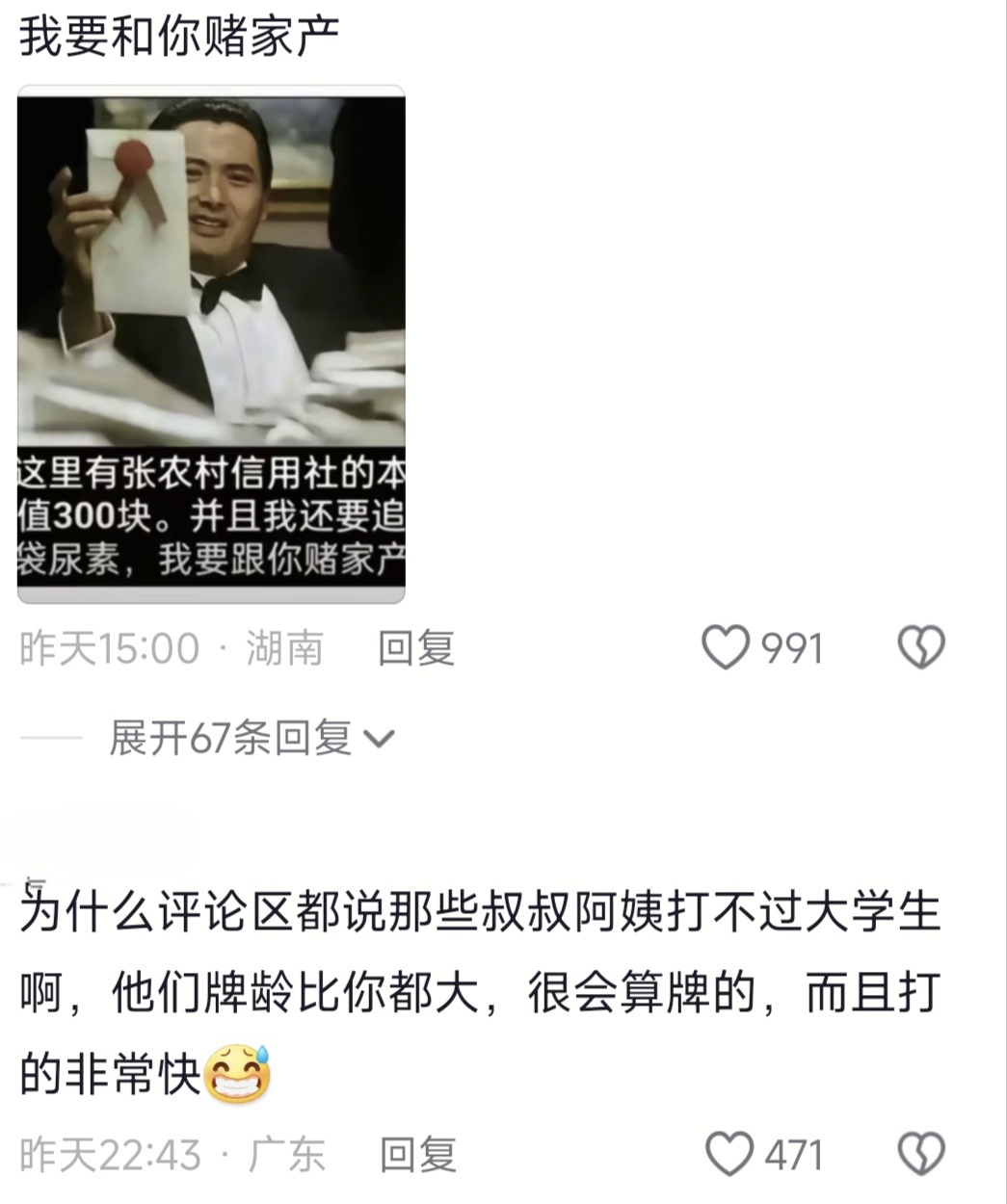 ζli如晨曦 2 2025-12-21 00:32 他们真的超级会打,就是你不小心说了一句话都能猜到你你手里牌的那种,我每年过年赢钱都是运气好是一点,还有就是不经常打牌然后又不按牌理出牌,他们就用正常套路算不到。