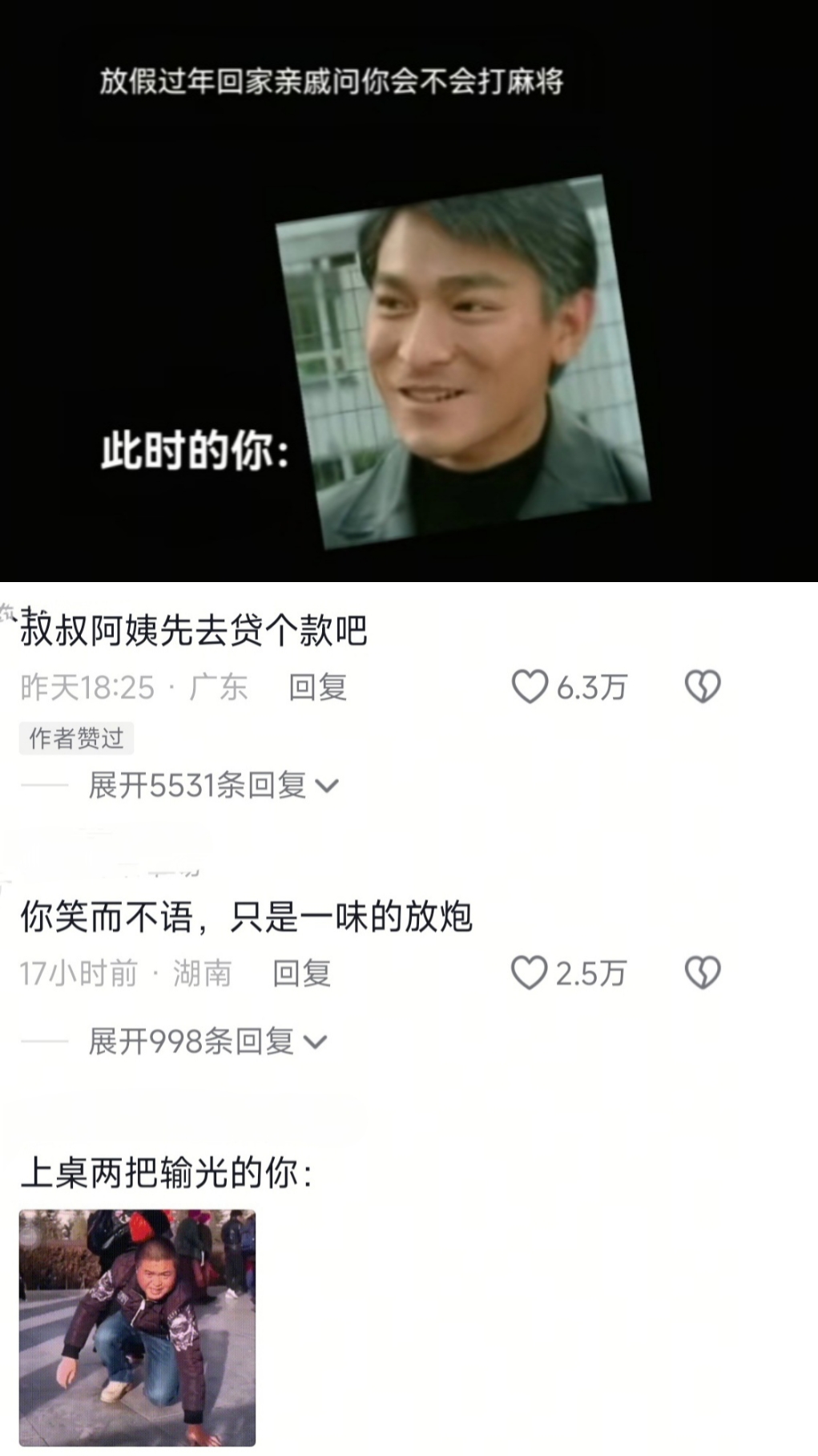 他们真的超级会打,就是你不小心说了一句话都能猜到你你手里牌的那种,我每年过年赢钱都是运气好是一点,还有就是不经常打牌然后又不按牌理出牌,他们就用正常套路算不到。