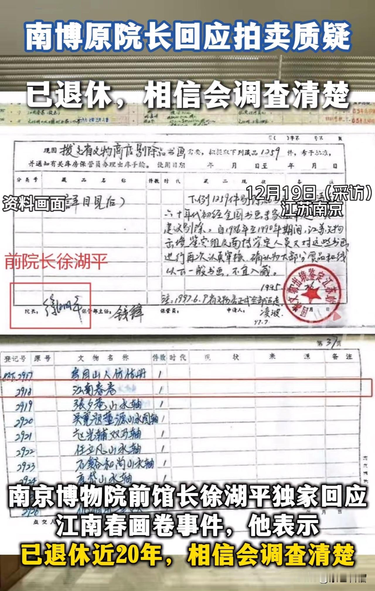 南博文物拍卖案后续: 南京博物院前院长徐湖平出面回应,称自己已80多岁,2008年就退休了,多年来不问世事,文物流失之事也没经过他的手。 徐湖平任南京博物院院长时间为2001年至2005年,而文物流失事件发生在2001年。当时一件文物被以6800元卖给一位姓顾的顾客,彼时该前院长正担任院长。 徐湖平表示自己没经手、不知情。作为院长,面对137件珍贵捐赠藏品中,某件在拍卖市场能拍8800万的文物以离奇方式流出博物馆的情况,仅靠“没经手、不知情”一句话无法免责。 作为前任院长,徐湖平回应时避重就轻,字是你签的,东西是你在任时流转的,一句不知情就能将自己撇得一干二净吗?对此,大家怎么看? (图片来源网络)