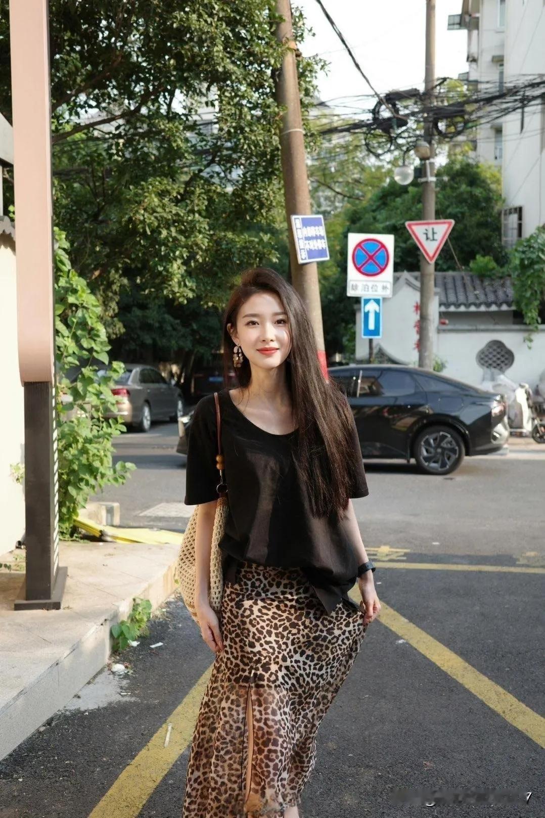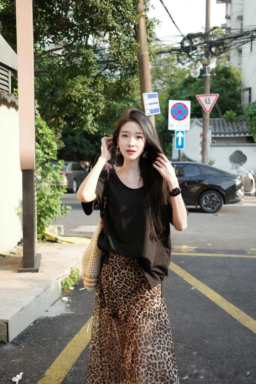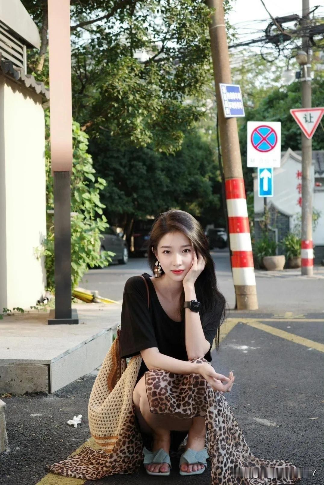 看到年轻女子坐在路边穿着豹纹裙,一下就想到了39岁的辛芷蕾穿豹纹裙的模样。辛芷蕾外号“东北大呲花”,出道前学服装设计,审美超棒。她穿的豹纹吊带连衣裙,质感十足,肩带用金色丝线,颜色深邃,成熟稳重又少了风尘气。她搭配高盘发和斜刘海,有八零年代复古歌星的味道,大红唇让她风情万种。不过豹纹裙确实不好驾驭,这年轻女子坐在路边穿豹纹裙,也不知是像辛芷蕾一样穿出了野性性感,还是穿得有些俗气呢。
