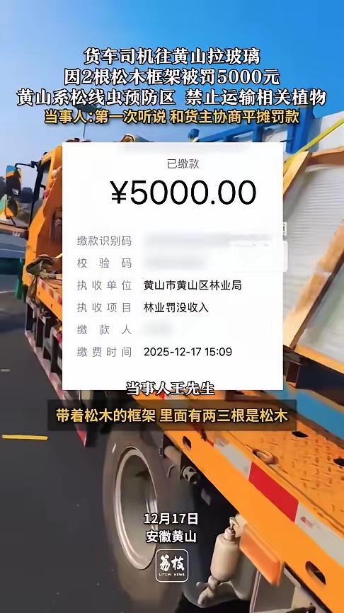 冤不冤? 12月17日,安徽黄山的高速路口上演了一出让货车司机欲哭无泪的事儿:一位外地司机拉着一车玻璃送货,下高速时却被工作人员当场拦下,罚单一开就是5000元,罪魁祸首竟然是保护玻璃的那几个松木框架!这位司机当时就懵了,跑运输这么多年,天南地北的货拉了不少,还是头一次听说这规矩,大老远跑一趟不仅没赚到运费,反而倒贴进去好几千,心里的憋屈简直能装一货车。 提到黄山,估计没人会陌生,就算没亲自去过,也一定听过那棵大名鼎鼎的“迎客松”。作为黄山的标志性景观,迎客松姿态优雅,伸展的枝干像是在热情迎接八方来客,每年都吸引着数百万游客不远千里前来打卡。可很多人不知道的是,这棵国宝级的松树,还有黄山漫山遍野的松树家族,都面临着一个致命威胁——松材线虫。这种肉眼几乎看不见的小虫子,堪称松树的“头号杀手”,它们会钻进松树的木质部,破坏树木的水分和养分运输系统,一旦松树被感染,短则一两个月,长则半年,原本郁郁葱葱的松树就会彻底枯萎死亡,而且这种虫害的传播速度快得惊人,一棵染病,周边成片的松树都可能遭殃。也正因如此,黄山被划定为松材线虫预防区,严禁松木及其制品进入,这可不是小题大做,而是为了守护整片松林的生存底线。 这位倒霉的司机姓王,是地地道道的河北汉子,常年开着大货车在周边城市跑运输,风里来雨里去,挣的都是辛苦钱。这次接了趟去黄山的活儿,拉的是一车易碎的玻璃,为了防止运输途中玻璃磕碰碎裂,装车时特意用木框架把玻璃固定得严严实实。王师傅怎么也想不到,就是这几个看似普通的木框架,给他惹来了大麻烦——其中两根框架用的是松木材质。下高速检查时,工作人员一眼就认出了松木,按照相关规定,当场开出了5000元的罚单。 拿着罚单的王师傅,脸皱成了一团苦瓜,他满肚子委屈地说,自己压根不知道黄山有这个禁令,货主也没提前跟他提过一句。要是早知道这规矩,他肯定会仔仔细细检查一遍木框架,哪怕自费换成别的木料也愿意,哪会落到现在这个赔钱又窝火的地步?辛辛苦苦跑一趟,钱没挣着不说,还得倒贴罚款,换谁谁心里都得堵得慌。 这件事在网上传开后,网友们也炸开了锅。有知情的网友说,只要是往黄山送货,带木质托盘、框架的货物都会被严查,就是为了严防松材线虫入境。毕竟松材线虫的破坏力实在太惊人,一旦传入,对黄山的生态环境来说,可能就是一场灭顶之灾。 在我看来,这件事里王师傅确实冤,但从保护黄山生态的角度出发,工作人员的执法也没毛病。这事儿的核心问题,其实出在信息不对称和责任划分上。货主作为本地或者熟悉黄山相关规定的一方,理应有义务提前告知司机货物包装材料的禁忌;而相关部门呢,除了在高速路口严查,也可以多在周边省市的物流集散地、货运市场做些宣传,比如贴些海报、发些宣传单,让更多外地司机知道这个禁令。毕竟,生态保护是大事,但也不能让守法经营的司机们为不知情买单。5000元的罚款,对靠跑运输养家糊口的司机来说,不是一笔小数目。只有把规矩说在前头,把宣传做到位,才能既守住生态防线,又不让无辜的人蒙受损失,这样才是真正两全其美的办法。