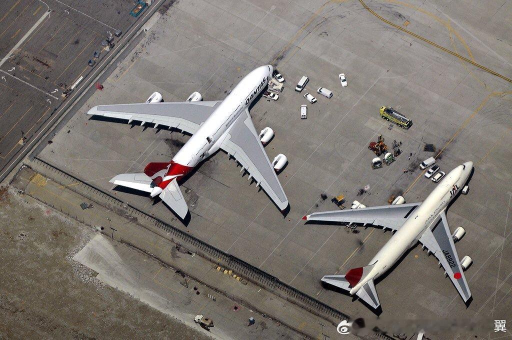 A380和波音747之间的翼面积差异,845.1平方米对比541.8平方米,A380的机翼面积比波音747-8大出约52%。A380庞大的机翼面积提供了巨大的升力,使其即使在最大起飞重量更大的情况下,进近和着陆速度也能比747慢约20 节(约 35 公里/小时),有助于缩短跑道占用距离并降低机场噪音。其实A380的机翼是按更长级别的机身标准设计的,可惜未能发展出加长型。