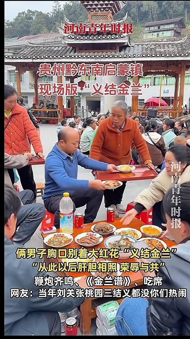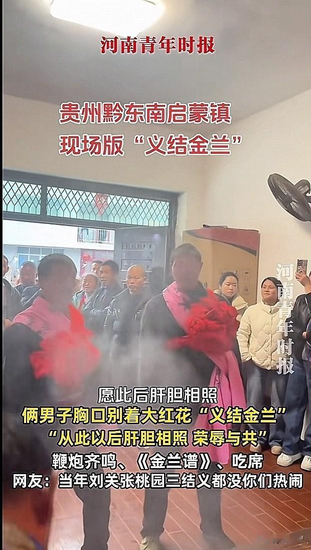 贵州俩大哥“义结金兰”,胸口都戴着大红花,当着一众乡亲的面郑重结拜,一句“从此以后肝胆相照,荣辱与共”听得让人热血动容! 现场鞭炮齐鸣,红彤彤的《金兰谱》一摆,仪式感直接拉满,场面比“桃园三结义”还热闹! 结拜之后,院里直接摆开流水席,乡亲们围坐在一起吃席喝酒,两位大哥端着酒杯,与大家把酒言欢,脸上笑开了花,整个村子都沉浸在这份热闹的欢喜里,朴实又暖心。 这样热闹的氛围,这样真挚的兄弟情,就是农村生活最动人的样子,简单、纯粹,满是人间烟火的快乐。 结拜情义 金兰结拜 金兰金兰 金兰图 来义结金兰 现场结拜 贵州 酒席