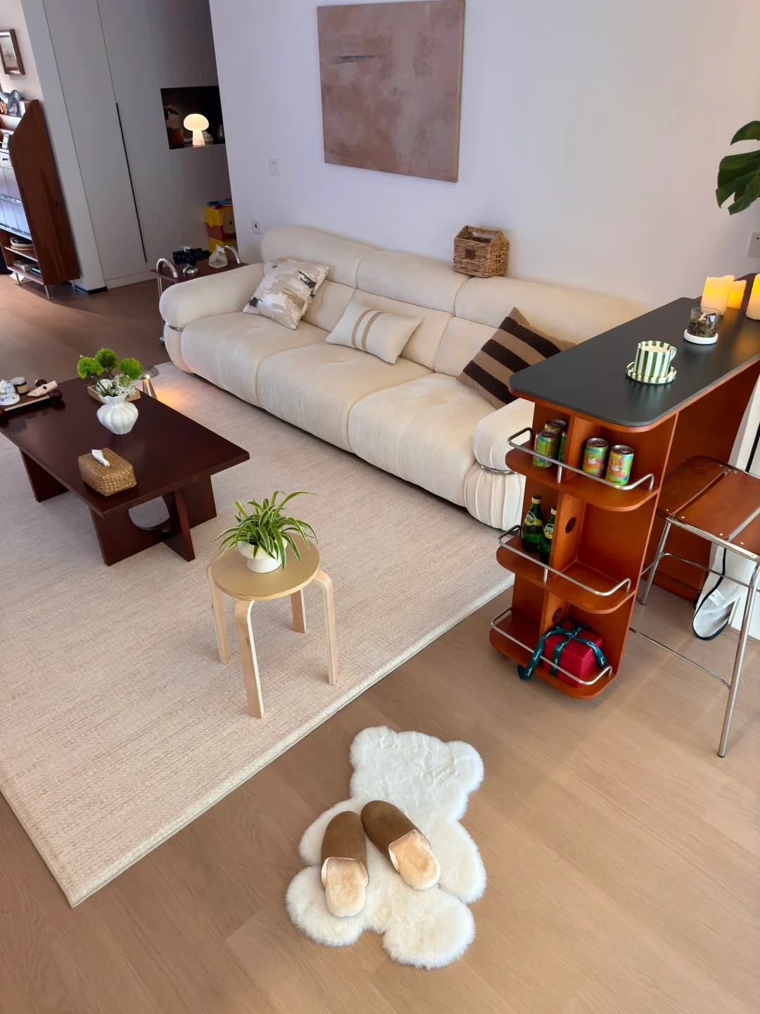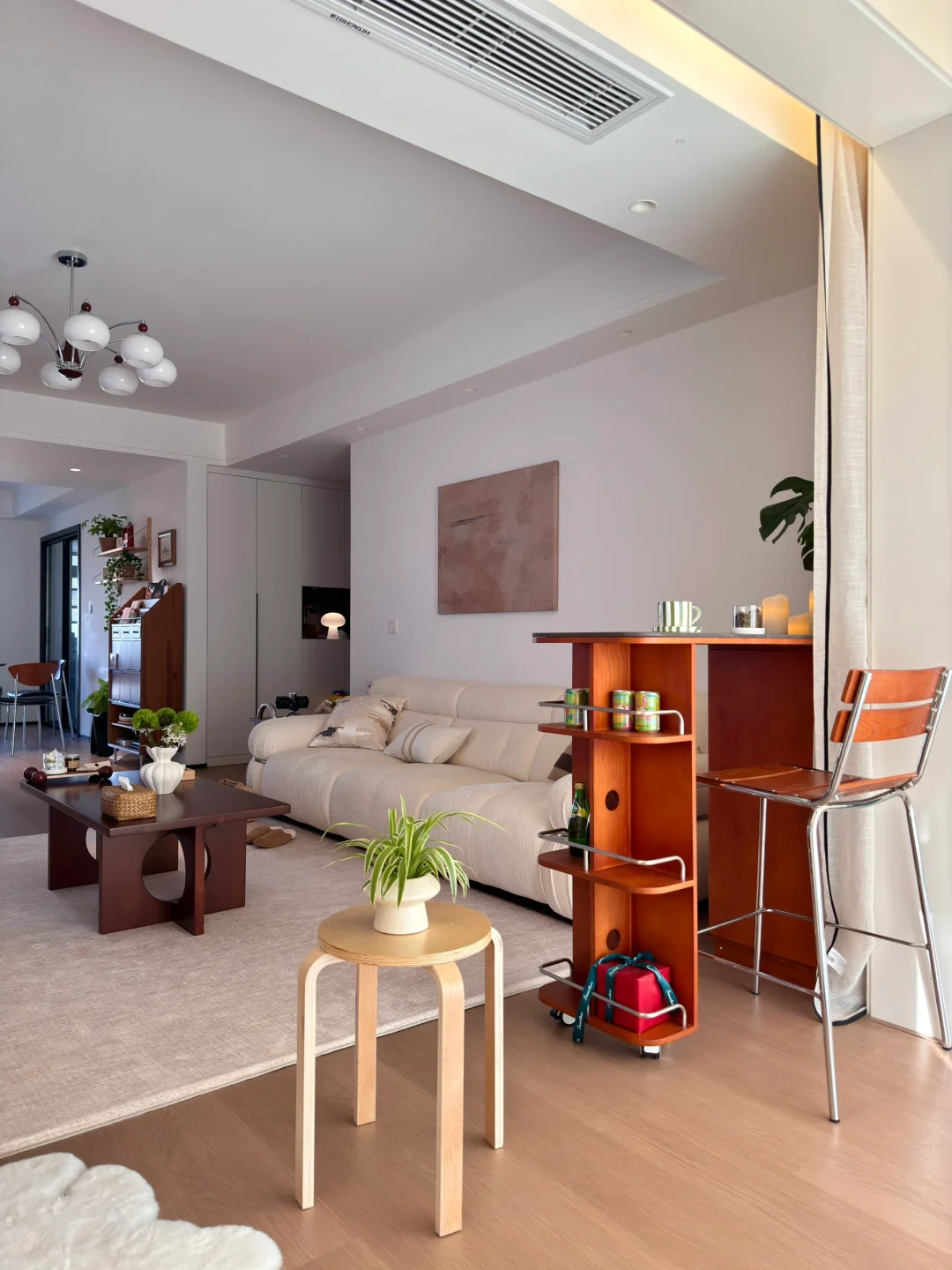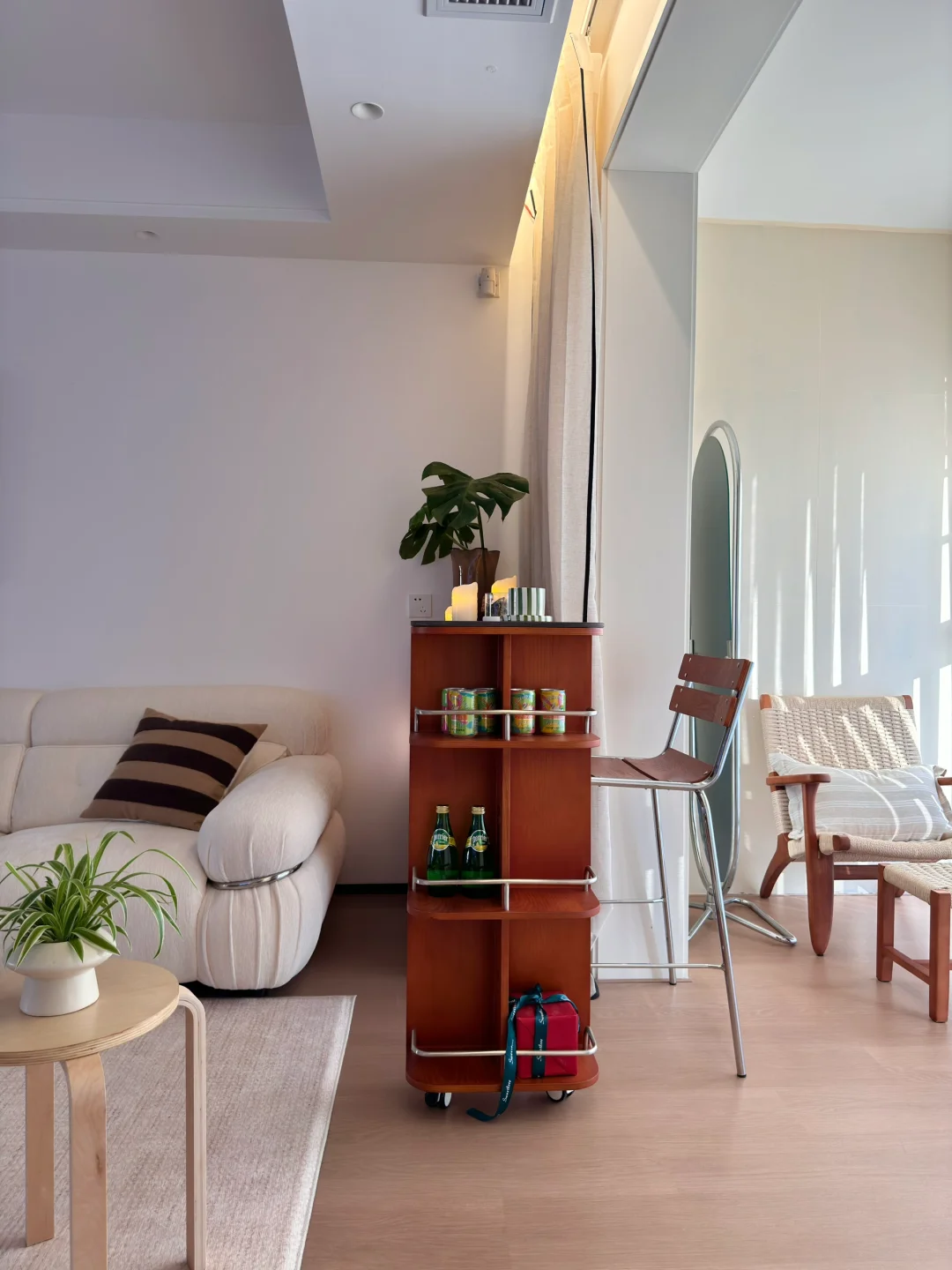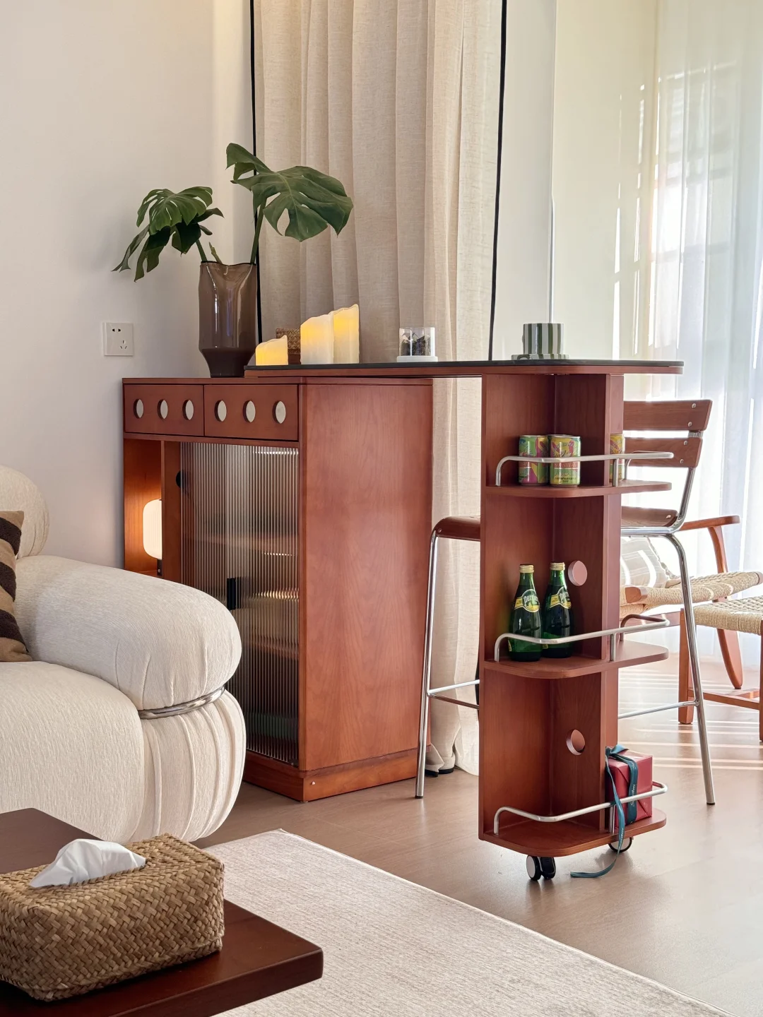 在小县城靠两个人的努力 付首付买下了这个套内110平的房子🏠 历时四个月装修把房子变成了家 入住已经三年啦 沙发角放置伸缩小吧台 收纳客厅小物件 平时坐在这里喝咖啡☕️办公 生活是拿来取悦自己的 偶尔给家里增加点小软装 就能让家里的氛围瞬间不一样了~