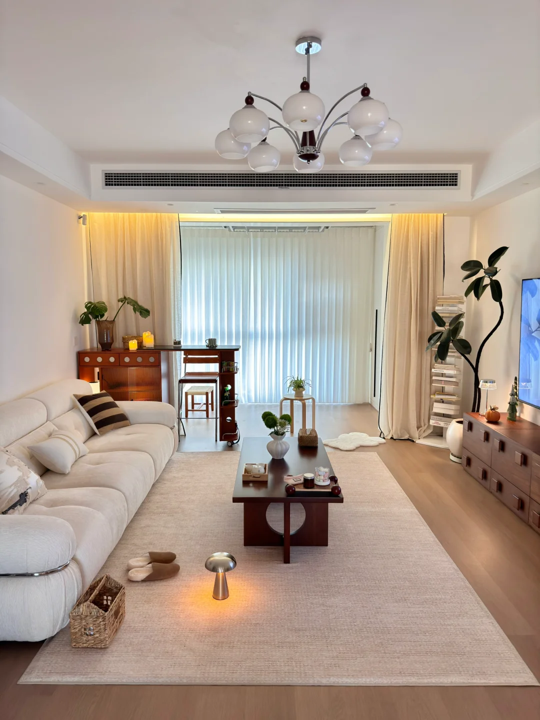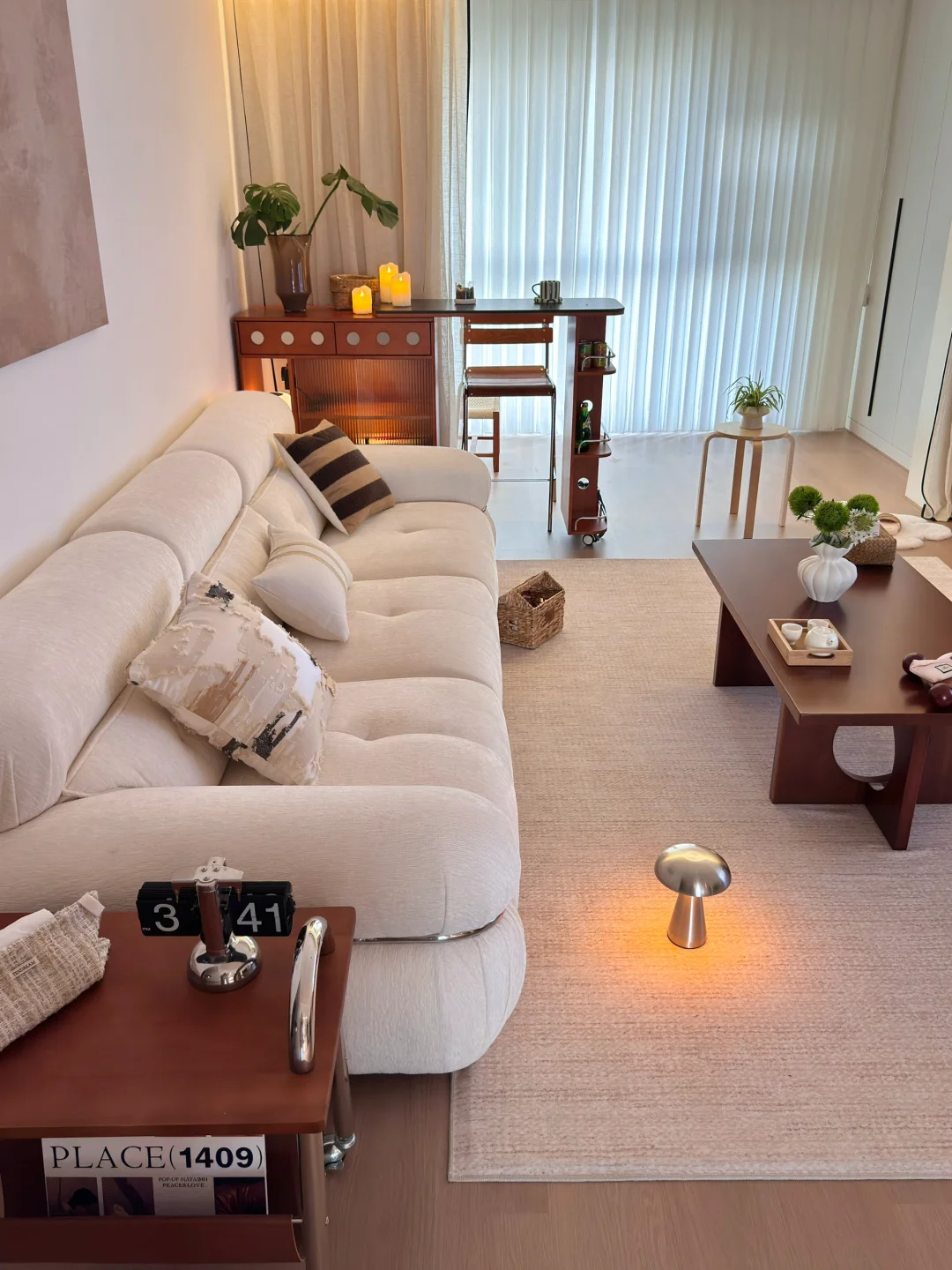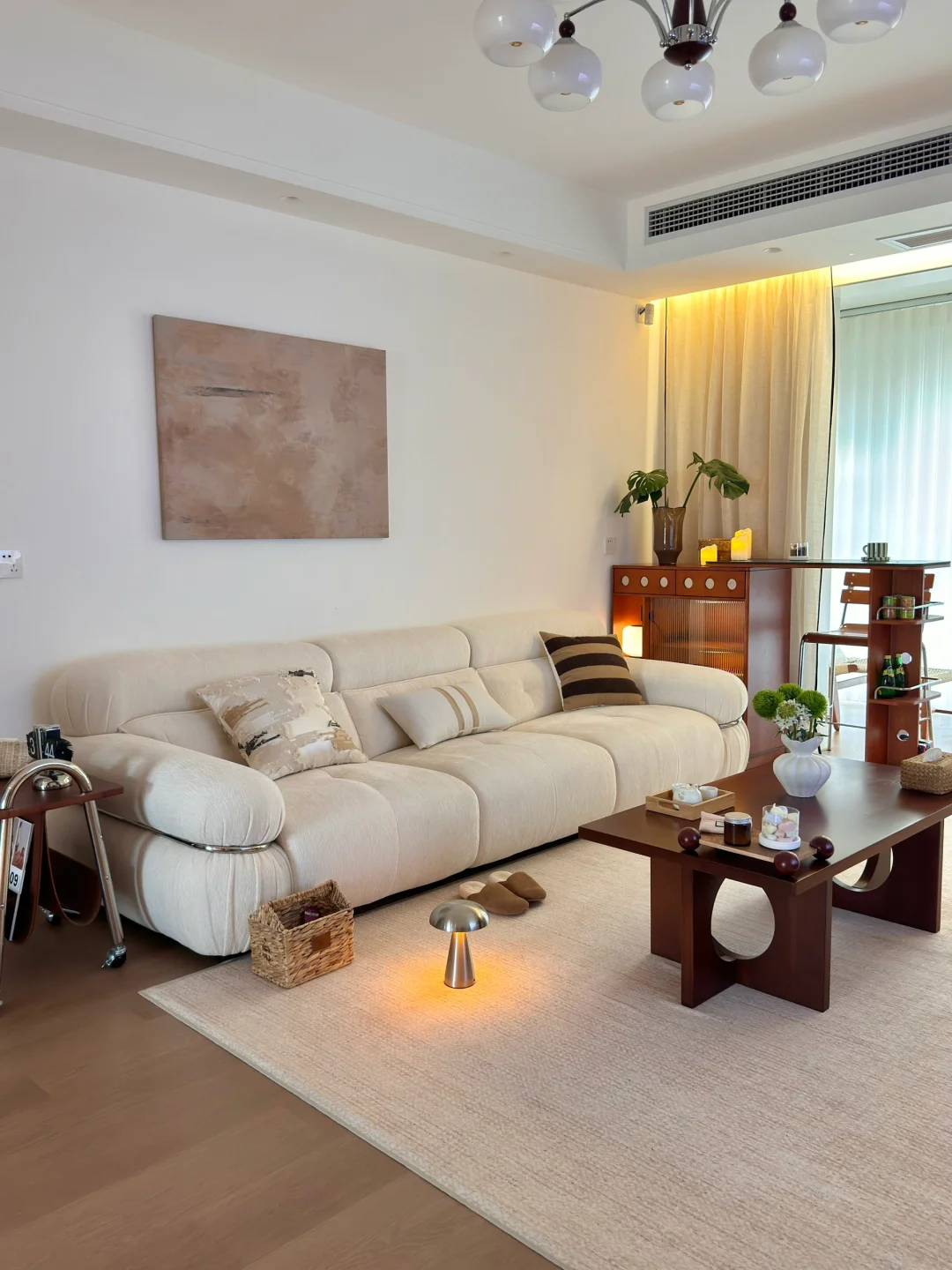 在小县城靠两个人的努力 付首付买下了这个套内110平的房子🏠 历时四个月装修把房子变成了家 入住已经三年啦 沙发角放置伸缩小吧台 收纳客厅小物件 平时坐在这里喝咖啡☕️办公 生活是拿来取悦自己的 偶尔给家里增加点小软装 就能让家里的氛围瞬间不一样了~