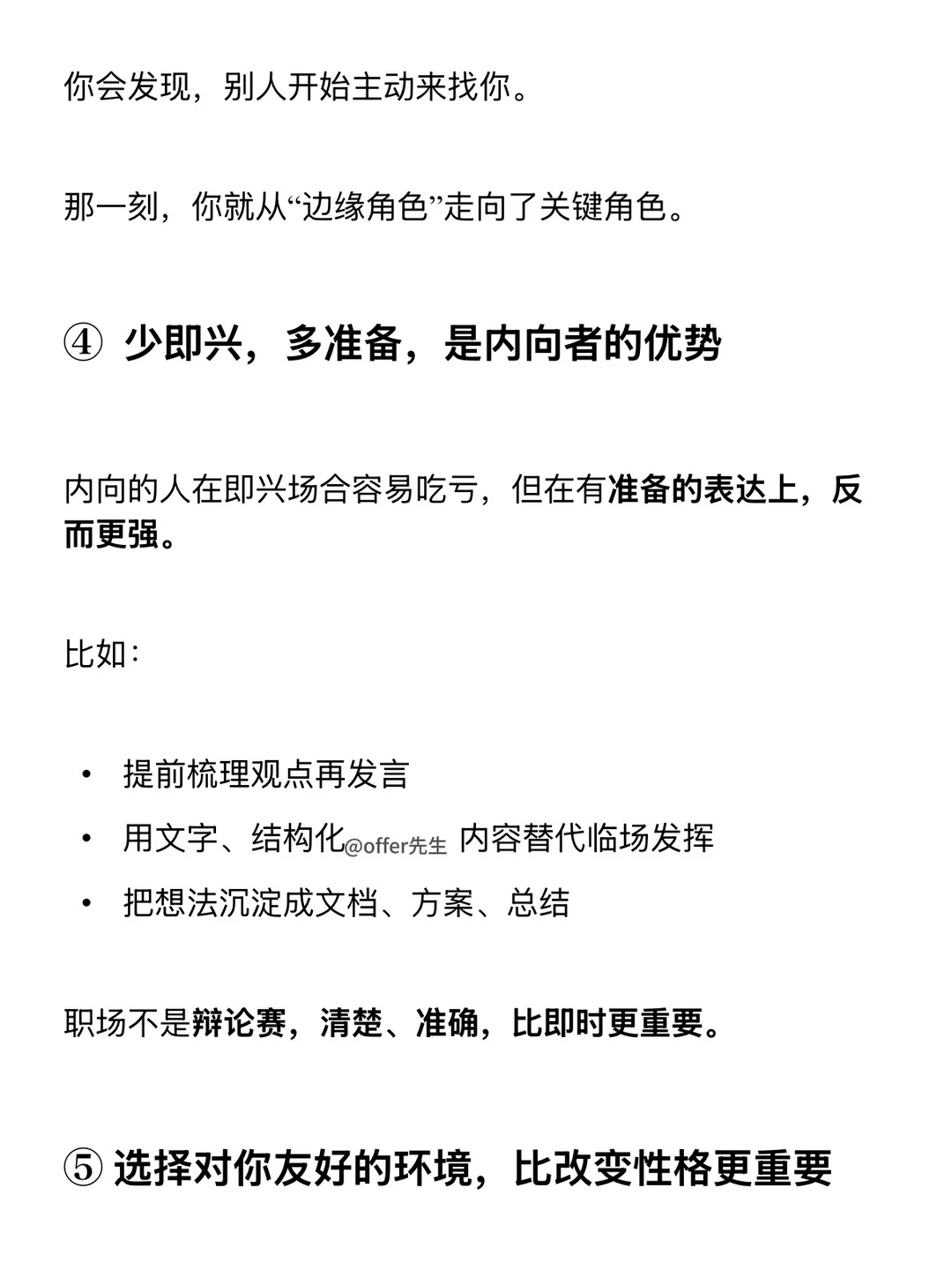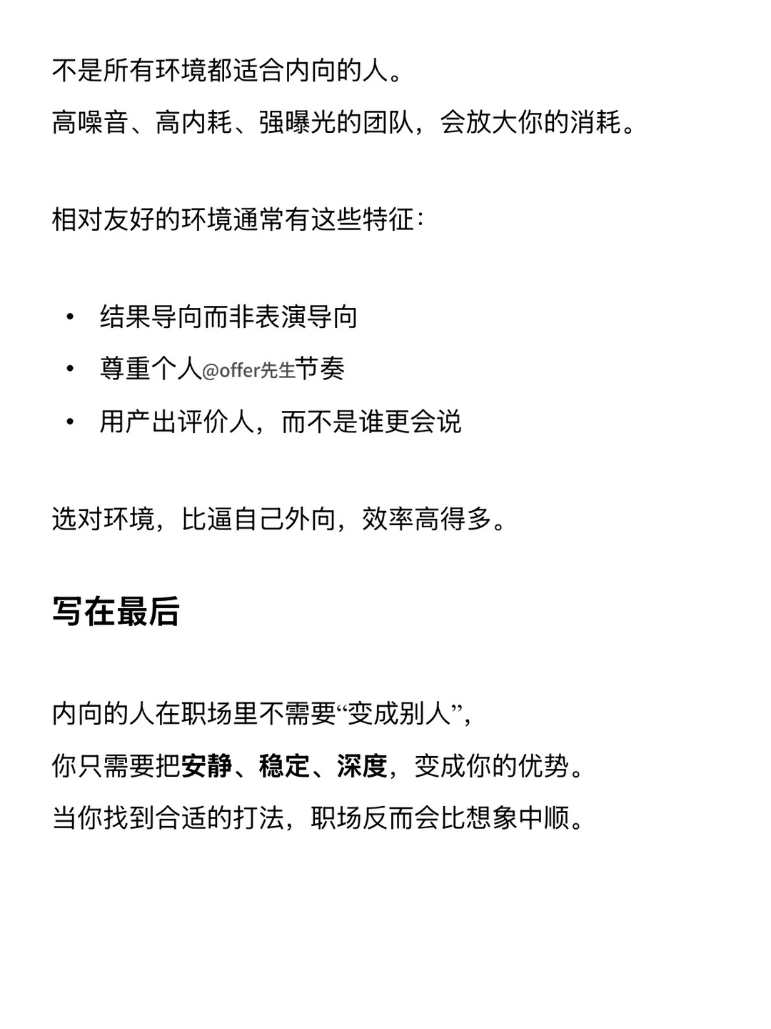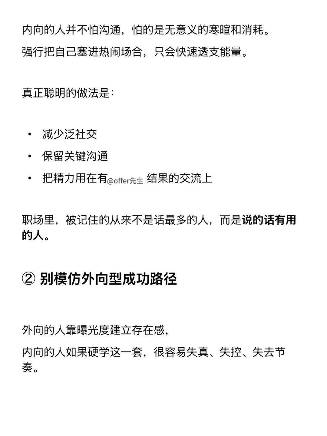 内向在职场里并不是劣势,真正拉开差距的,是有没有找到适合自己的生存方式。 很多内向的人走得累,不是因为性格本身,而是用了不适合自己的打法。 ... 一个认真分享“找工作”干货的账号,真诚、有料、不说空话 ·