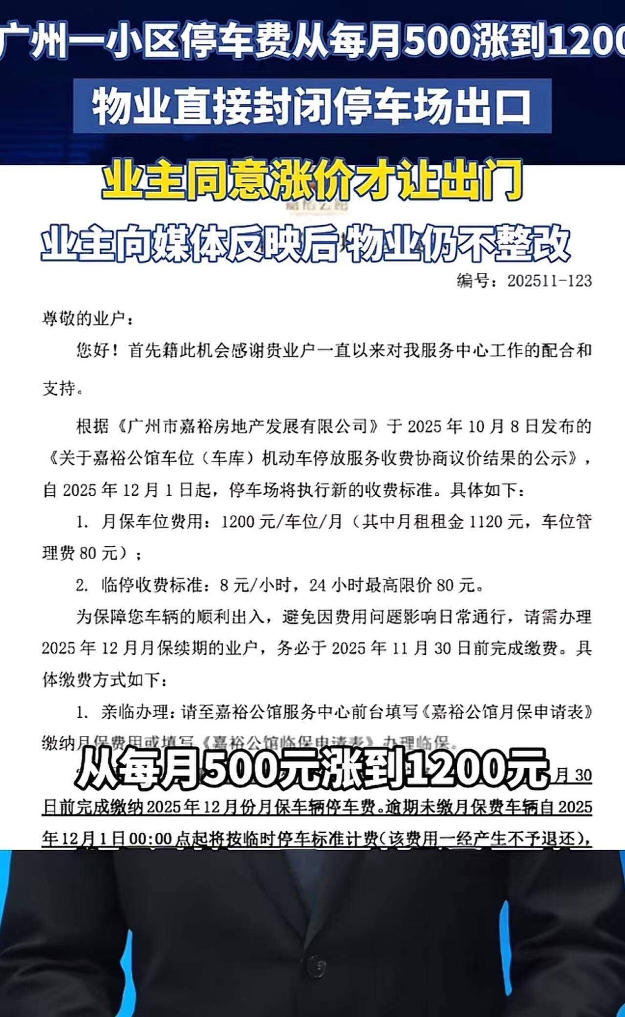 法治社会还敢这么嚣张?广州一小区,物业单方面宣布停车费从每月500元涨到1200元,为了逼业主交钱,物业直接封闭停车场出口,业主同意涨价才让出门!业主:跟恶霸一样,我们很多人不交钱,上班上学都迟到了! 法治社会还敢这么嚣张?这不仅仅是一场简单的停车费涨价,更像是一场现代“霸王条款”的公开展示。在广州某小区,物业单方面宣布将停车费从每月500元涨到1200元,短短一夜之间,业主们的生活被彻底打乱。更令人震惊的是,为了“逼”业主们交钱,物业竟然直接封闭了停车场出口,要求业主“只有交了钱才能出门”。这不禁让人质疑:当法律的底线被如此践踏,我们的权益还能靠什么守护? 很多业主反映:“我们跟恶霸一样,交了钱还得看他的脸色。”确实,面对物业的强硬手段,许多人选择了忍让。可是,忍让究竟能换来什么?是不是每次遇到“涨价”,都要被“封门”?更别说,很多业主因为交通受阻,迟到了上班,孩子也因此耽误了上学。这种“以大欺小”的霸道手段,难道真的是我们社会应有的常态吗? 这让我想起一个深刻的问题:在一个法治社会,法律的底线在哪里?物业的行为,是否已经越过了法律的界限?如果没有有效制止,这样的“恶霸”还会像变戏法一样,继续用威胁和封锁来掌控业主的生活。难道我们只能任由他们“横行”吗?答案当然是否定的。问题的根源在于法律的刚性执行与监督缺失,也在于我们每个人对权益的漠视。 这不是个别现象,而是一面镜子,折射出我们社会中潜藏的信任危机和规则缺失。面对这种情况,业主们需要什么?不仅仅是“涨价”的抗争,更是全社会对“霸王物业”的警醒与反思。我们需要的是一套真正保护业主权益的法律体系,让物业公司不再有恃无恐,成为服务而非压迫的“守门员”。 更重要的是,每一个普通人都应该意识到,自己的权益不是“天上掉馅饼”的恩赐,而是用法律和集体的力量争取来的。也许有人会说:“这事太小,没必要闹得太大。”但正是这些“微小”的权益被侵蚀,才逐渐侵蚀了我们对公平正义的信心。 所以,面对这样的“霸道行为”,我们不能沉默。我们要用法律的利剑捍卫自己的权益,让那些肆意践踏规则、仗势欺人的“恶霸”知道,社会的底线不能被轻易突破。只有这样,我们的生活才能真正回归公平与正义,也才能让那些想要“凭霸道赢得一切”的人知道:法治的天平,终究会为公平倾斜。 这场“封门事件”,不仅是一次物业和业主的冲突,更是社会治理和法治建设的一次大考。我们期待的不仅是一次胜利,更是一份对未来的承诺:让每个人都能在法律的庇护下,安心生活,无惧霸道。