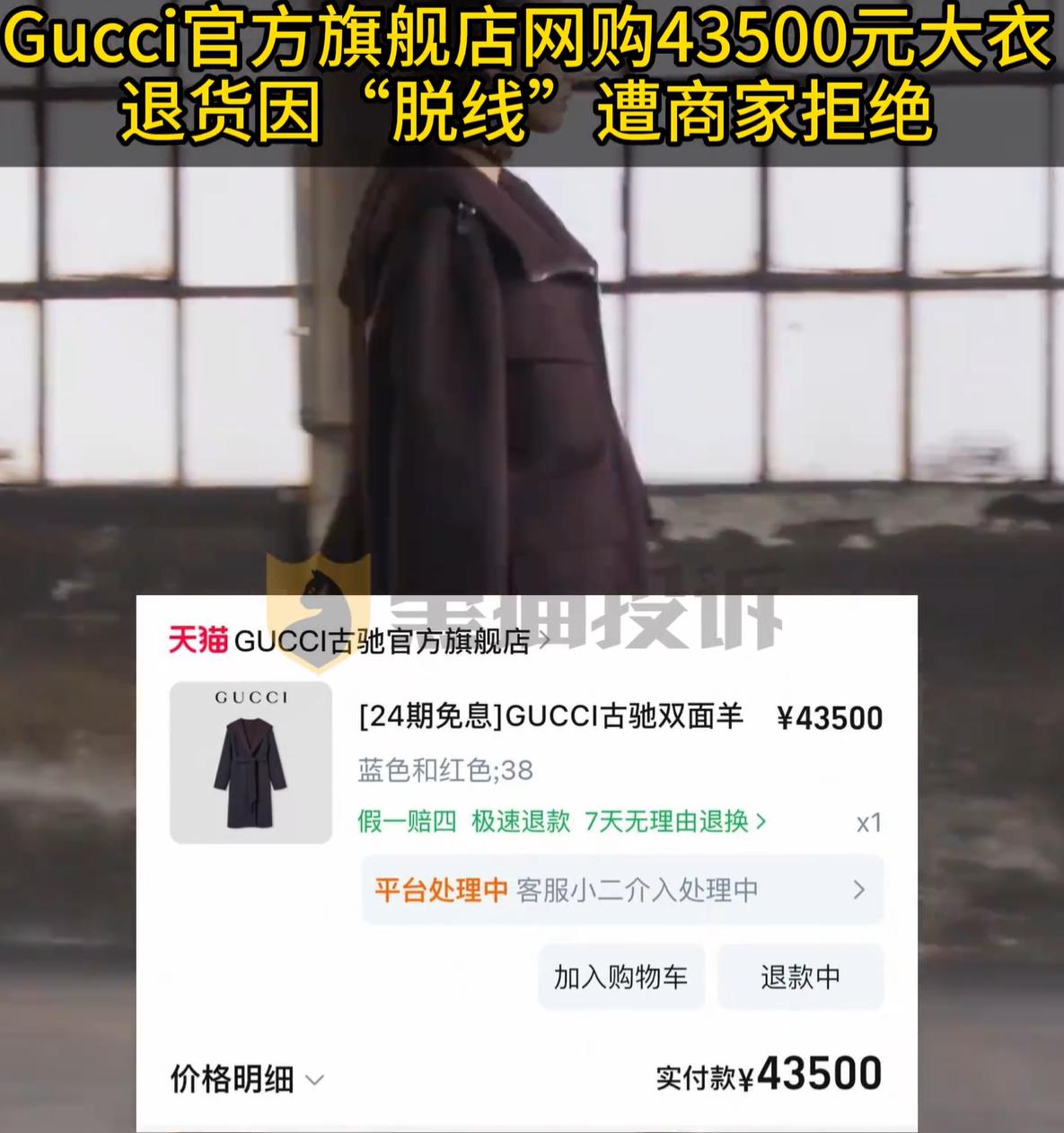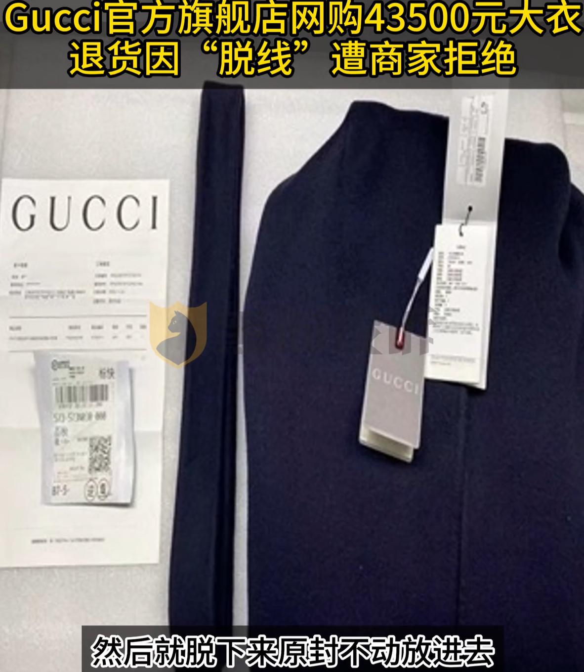 这下真解释不清了!江西,一女子花40000多元在官网买了一件GUCCI大衣,到家后试穿觉得不满意,就进行了退货,没想到,衣服退回后却被商家拒收,理由是腰部一根线出现“脱线损坏”,可女子却相当委屈,因为自己整个试穿过程也就一分钟,她甚至都不知道有脱线的问题存在 陈女士介绍,这家衣服是花43500元购买的,下单前她特意问过客服,得到的答复很明确,支持7天无理由退换。衣服到手后,她试穿了一下,觉得版型不太适合自己,没犹豫,立刻按流程申请退货。包装、吊牌都在,衣服也放回了原样,整个试穿过程她自己说不超过一分钟 结果衣服寄回去后,被拒收了。理由是腰部有一根线出现脱线,属于损坏,不符合退货标准 陈女士当场就懵了。她说自己根本没注意到所谓的脱线问题,也不清楚这是从哪来的。负责上门取件的快递员也表示,取件时没看到衣服有明显异常 陈女士反复解释试穿时间很短,也提出衣服可能本身就存在瑕疵,或者是之前试穿留下的问题。客服的态度很一致,仓库质检发现了脱线,无法还原消费者试穿时的状态,只能按照质检结果处理,退货请求继续被拒绝 事情在网上传开后,不少人都替陈女士不平。有人说,这么贵的衣服,质量难道这么脆弱?试穿一分钟就能脱线?也有人猜测,是不是仓库或物流环节出了问题,却让消费者背了锅 这件事的尴尬点不在于一根线值不值四万多,而在于消费者几乎没有自证空间。高价服装退货,往往只有商家质检说了算。衣服在消费者手里一分钟,在仓库灯光下被放大检查,任何一个细节都有可能成为拒退的理由。问题在于,这个细节是不是本来就存在,消费者很难说清 很多人可能会说,高端品牌本来就标准严格。问题是,既然承诺了7天无理由,前提就应该是非人为明显损坏,而不是靠一根几乎不影响穿着的小线头,直接否定退货资格。否则无理由这四个字,只剩下字面意思,真正执行时全凭商家解释 我觉得这事也是个提醒,奢侈品牌的“无理由退货”其实隐含了许多未明说的条件。线头、轻微皱褶、气味改变都可能成为拒退理由。消费者购买前最好仔细阅读退换条款,不要轻信口头承诺