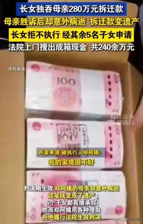 上海一女子独吞母亲280万拆迁款的故事,像极了一部家庭伦理剧,却又骨子里透着现实生活的无奈和冲突。母亲起诉后虽胜诉,却迟迟拿不到应得的钱,没想到她竟然在等待中离世,这笔钱旋即变成遗产,牵扯出六兄弟姐妹的权益纷争。 面对这笔继承款,这位女子却铁了心不肯分给兄弟姐妹,每天竟然躺在100万现金堆上睡觉,完全不顾法律和亲情的双重压力。两次被拘留、房屋被查封,也没能让她松口,这样的固执与自私,让许多网友义愤填膺。 但是什么原因,让她宁愿承受法律制裁,也不肯放弃这笔钱?背后又折射出怎样复杂的家庭关系和人性挣扎?很多声音说:“亲情难道真能抵挡住钱的诱惑?”“这样的行为简直把亲情当儿戏!” 然而,事实没有那么简单。这个故事透漏出当下拆迁赔偿、家庭利益和继承权之间错综复杂的矛盾。钱,成了试金石,辨别一个家庭成员到底是守护亲情还是只顾私利的分水岭。也让我们反思:金钱在亲情中的地位,如何找到一个既合理又温暖的平衡点? 而这场纷争的最终结局,更是让人深思。女子被拘留、财产被查封背后的坚守,或许是一种内心的恐惧、孤独,甚至是对自身权益的极端保护,也可能是家庭矛盾的激化,无法用简单的对错判断。 这起事件提醒我们,无论身处怎样的困境,亲情的纽带需要我们用智慧和耐心去维系,而非被利益撕裂。法律是最后的保障,但和解与沟通才是解决纷争的最佳途径。 网友们对此议论纷纷:你怎么看这位女子的行为?面对家庭财产纠纷,究竟如何守住亲情、避免撕裂?欢迎留言分享你的看法,一起探讨现代家庭面对金钱诱惑时的守与舍。 金钱虽重要,但爱与理解更能让家庭长久。希望每个家庭,都能从这场风波中学会珍惜和宽容,让亲情成为最坚实的依靠。儿女争拆迁款 母亲遗产