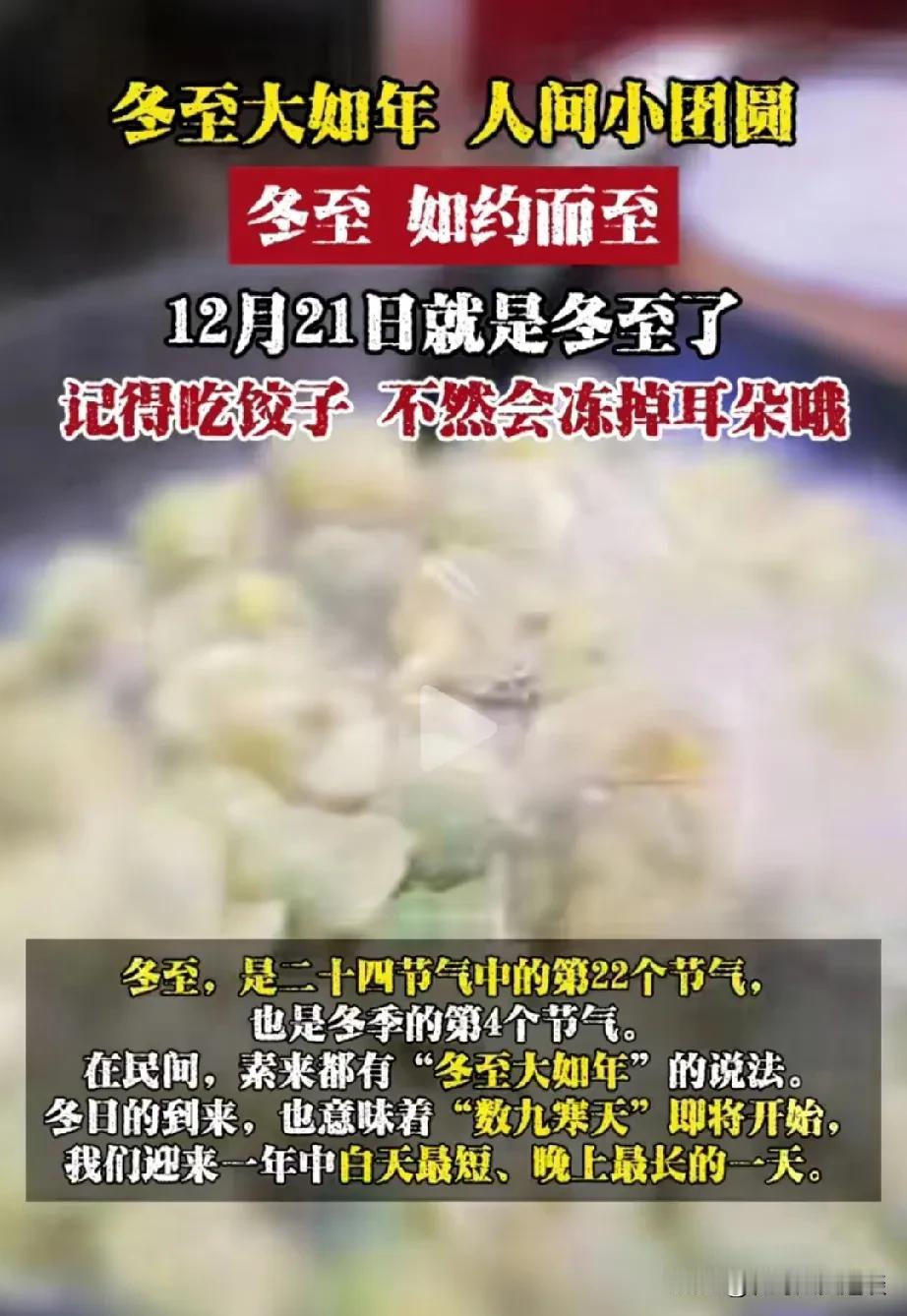 冬至到了,明天记得吃饺子哦,要保护好自己的耳朵哦[呲牙][呲牙][呲牙]。 冬至是第22个节气,也是白天最短,黑夜最长的一天。