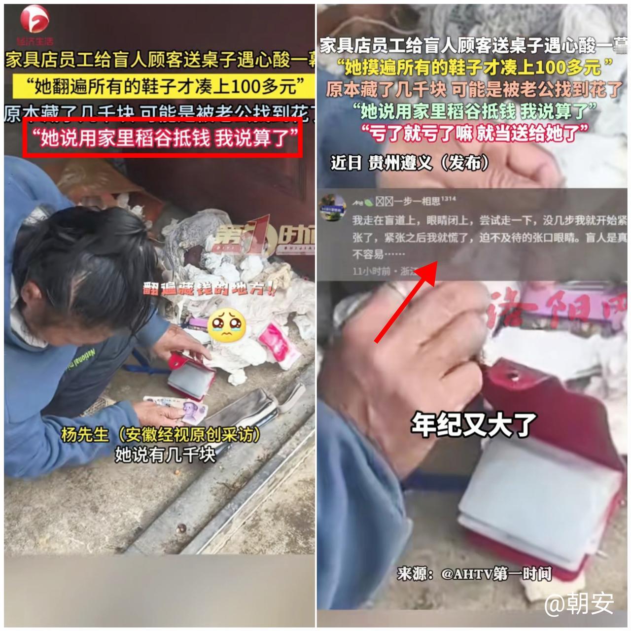 “活该发财”从来不是运气? 而是善良攒下的底气! 贵州遵义的冷雨天里,盲人阿姨摸遍鞋底凑127块买桌子的模样,戳中了无数人的心。 阿姨家有卧病的老伴,全靠低保和手工活过活,攒了大半年的钱不翼而飞,只能想着用口粮稻谷抵账。 换别人可能嫌麻烦,但家具店杨先生没多犹豫,收100块还悄悄塞回200块,说这是“敬老补贴”。 其实生意的本质从来不是只算金钱账,而是把人心放在首位。 杨先生没觉得自己亏了,反而用小小的善意,给困境中的老人撑起了体面。 后来网友特意赶来支持,不是为了便宜,而是愿意为这份真诚买单。 善良从不是亏本买卖,而是最珍贵的口碑资产。 你身边有没有这样用小事暖透人心的普通人? 运气之说的真相 假如命苦是天赋 来评论区说说他们的故事~
