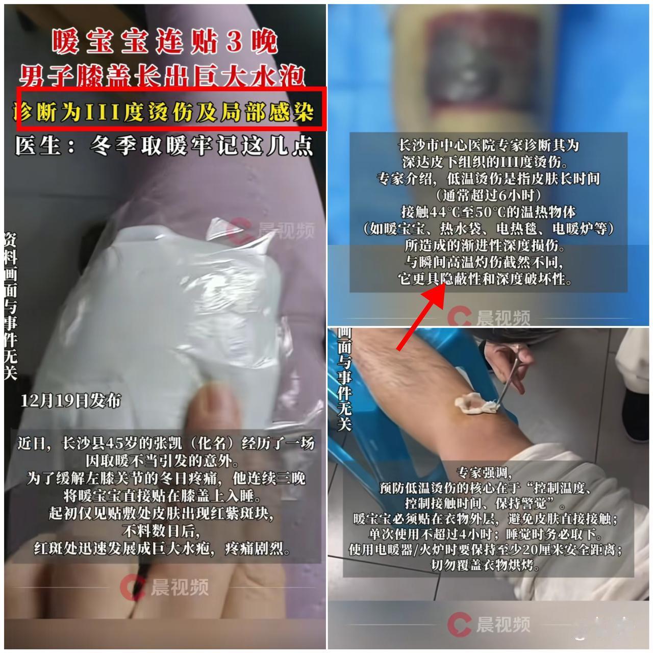 暖宝宝不是“救命贴”! 长沙男子贴两晚竟被Ⅲ度烫伤,这提醒真该刻进脑子里! 很多人觉得暖宝宝温温的没危险,直接贴皮肤才舒服,却忘了它44-50℃的温度,长时间接触就是“温水煮青蛙”式伤害。 男子膝盖疼想缓解,贴完发红还不当回事,结果起了大水泡,这就是忽视安全细节的代价。 取暖的核心是“安全”不是“图方便”,说明书上“隔衣贴”的提醒真不是废话。 老年人、糖尿病人或皮肤敏感的人,更得警惕这种“隐形烫伤”,毕竟舒服一时,疗伤可就麻烦太久了。 你家的暖宝宝是怎么贴的? 有没有遇到过类似的取暖小意外? 来评论区分享你的安全妙招~