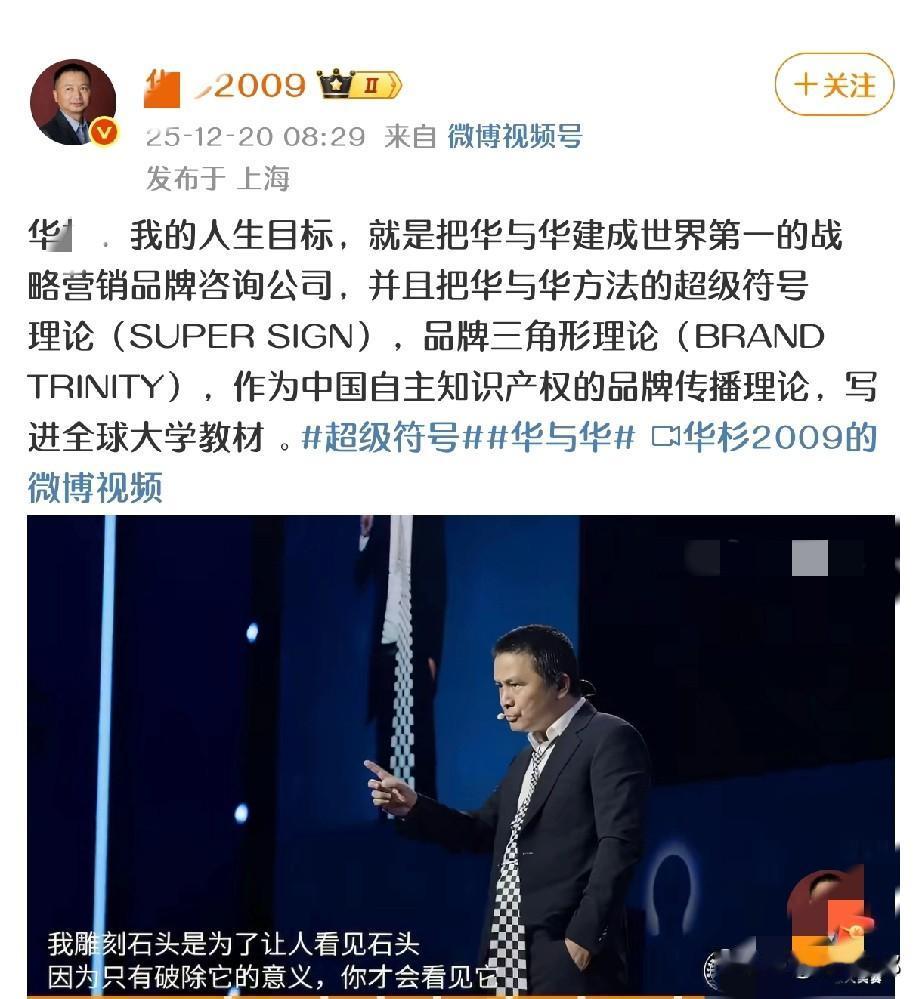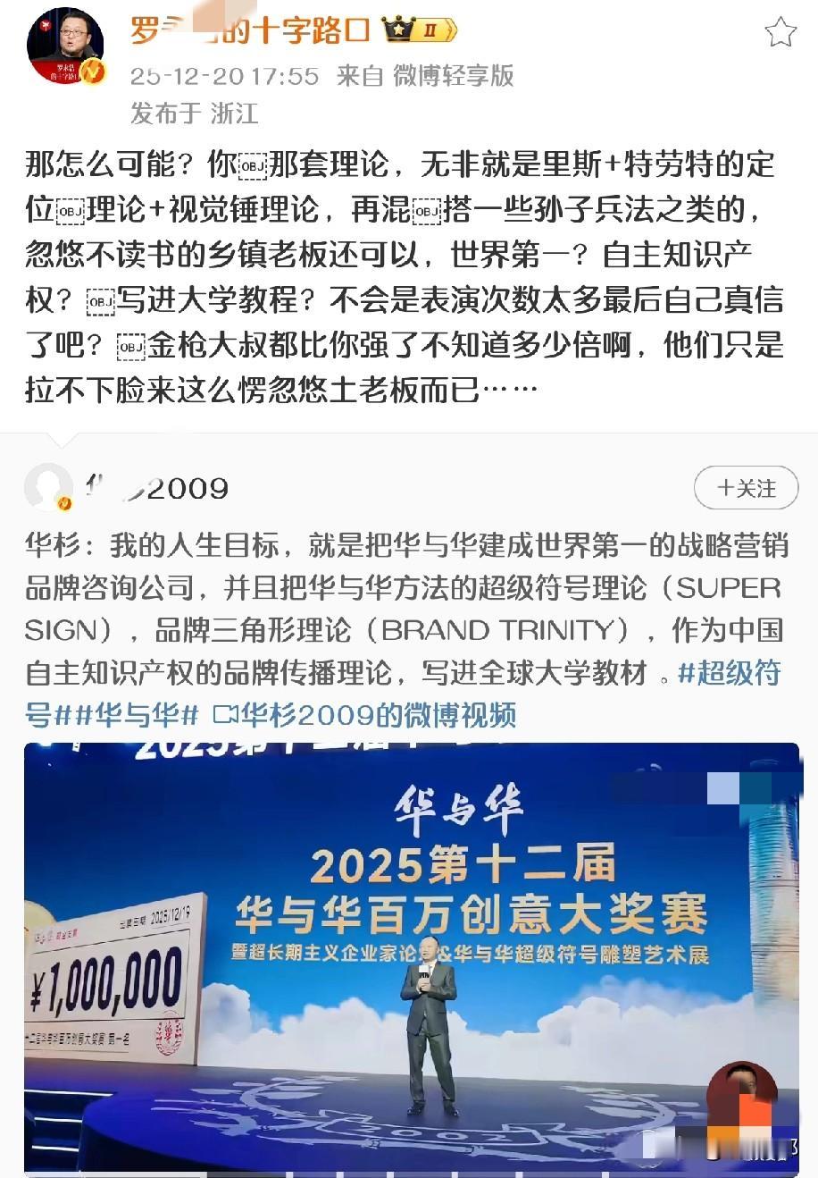 罗永浩 再怼 华杉: “忽悠不读书的乡镇老板还可以,世界第一?不会是表演次数太多最后自己真信了吧?” 华老板在昨天上海举办【百万创意大奖赛】后 ,发布了新动态,主要表达三大愿景: 🔸人生目标,把华与华做成世界第一; 🔸把“超级符号”做成自主知识产权; 🔸把华与华写进全球大学教材! 老罗毫不客气@华老板,开怼,大意是: 🔸忽悠读书少的土老板 🔸莫名的自信 🔸不要脸 华老板依然保持一贯作风“懒得理你!”,大有一种让“罗锤子吠吧,走自己的路”的一种气势! 看来老罗是要跟华老板怼到底了,尽管华老板默默承受着,骂不还口,打不还手,但是老罗怼完一次又一次,就等着华老板在“沉默中爆发”的那一刻😂😂 (取材:微博)