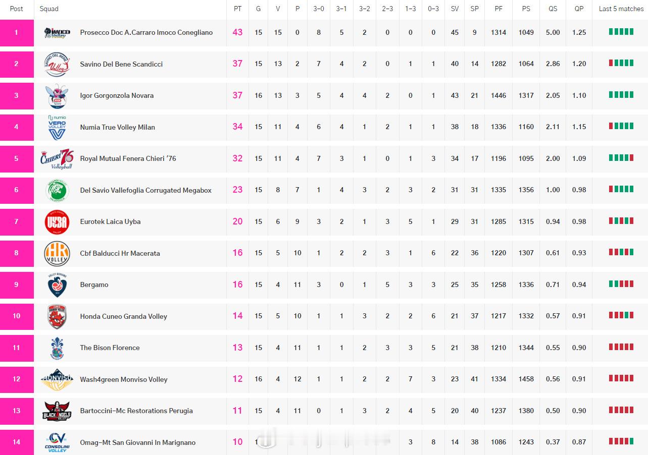 【意甲女排最新积分榜:米兰逼近前三 保级区形势紧张】中国排球留洋动态 国际排坛动态 12月20日,意甲女排第15轮战罢,卫冕冠军科内利亚诺15连胜43分继续遥遥领跑,斯坎迪奇13胜2负37分排名次席,多赛一场的诺瓦拉13胜3负37分暂列第三,米兰34分力压同为11胜4负的基耶里2分,位居第四。降级区在圣乔瓦尼取得久违的胜利后,形势变得紧张起来:圣乔瓦尼分别只落后佩鲁贾1分、皮内罗洛2分、佛罗伦萨3分、库内奥4分,这几支球队的任何一场胜利就可搅动保级形势。