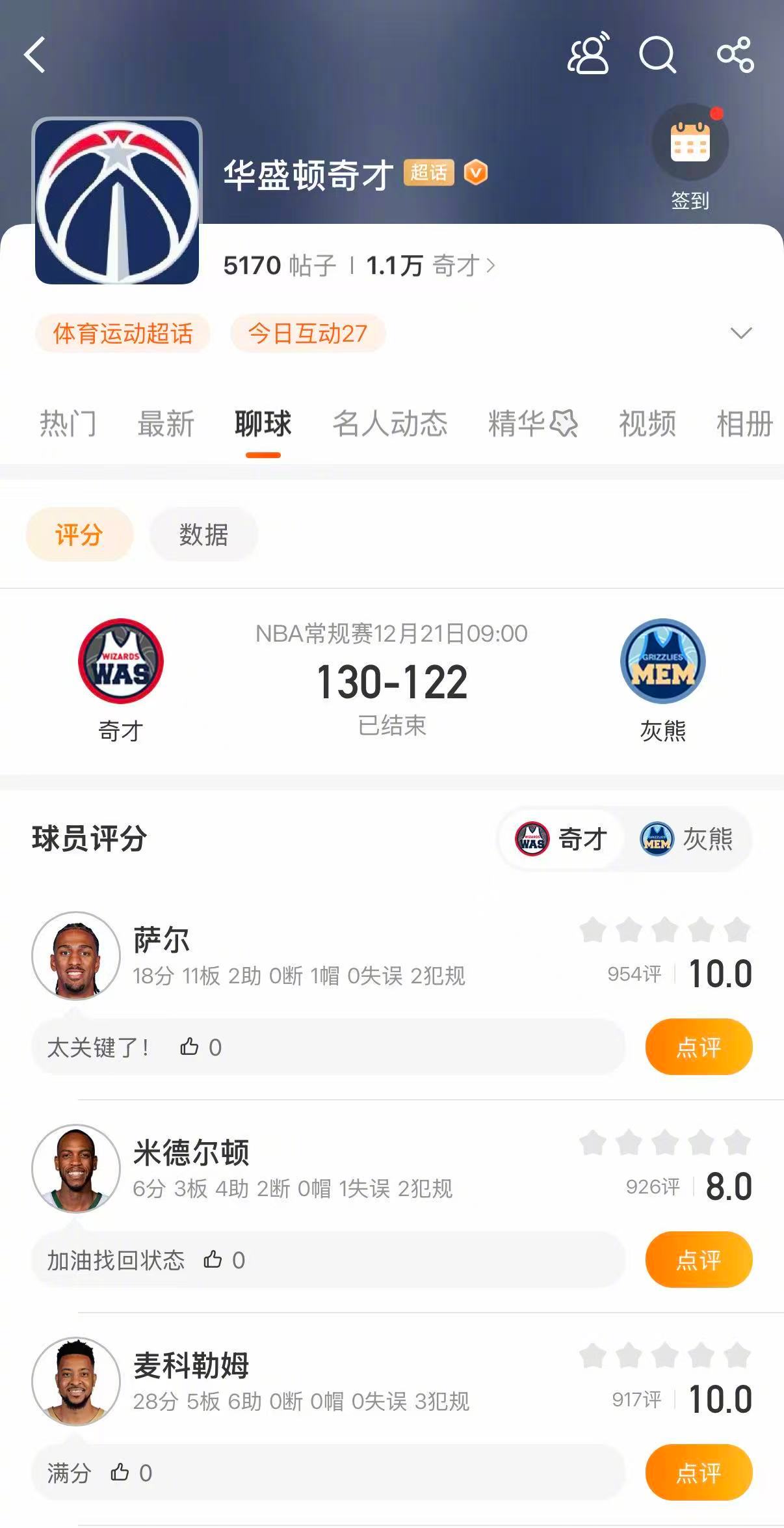 奇才战胜灰熊 奇才130-122战胜灰熊。麦科勒姆28分5篮板6助攻,乔治28分,萨尔18分。灰熊方面,阿尔达马37分10篮板,杰克逊22分,斯潘塞19分。欢迎大家进入球队超话华盛顿奇才 和孟菲斯灰熊 对球员表现进行评分!