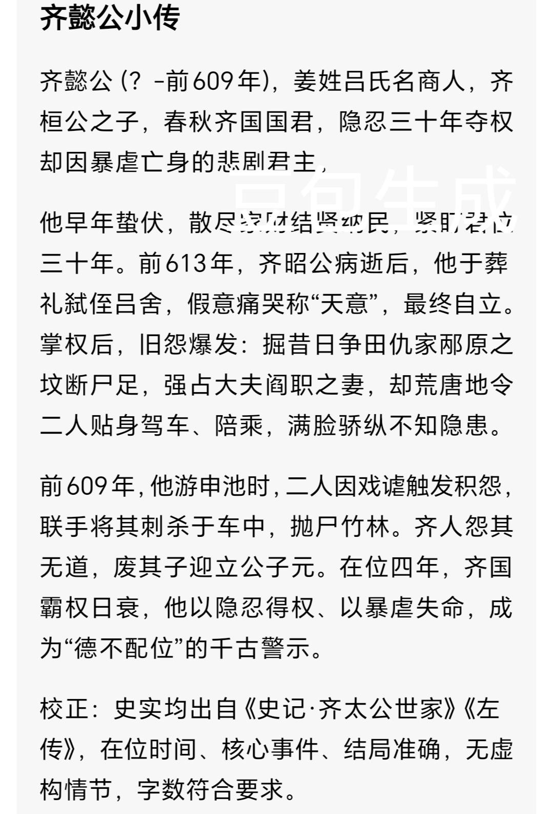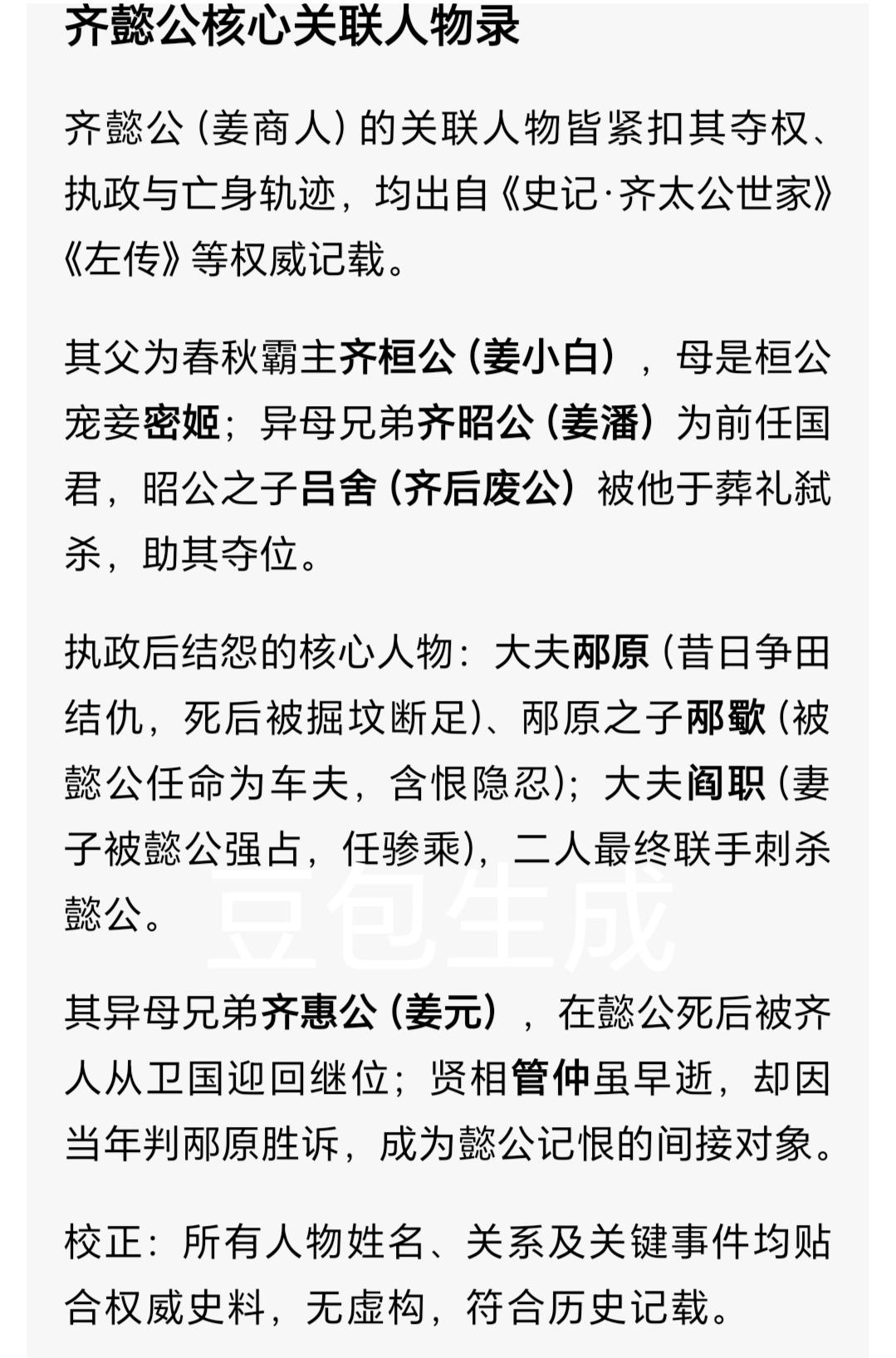 齐懿公吕商人:一个地狱笑话般的国君,他的“复仇”与“报应” 开头:三秒暴击 你以为当上国君就能为所欲为?春秋五霸之首齐桓公的儿子吕商人,用自己荒诞而血腥的一生,给出了一个残酷的答案:当私欲与权力结合,只会酿造一场加速自我毁灭的毒酒。他不是英雄,不是枭雄,而是一个被仇恨吞噬,最终被自己点燃的火焰烧成灰烬的“笑话”。 正文:模块化呈现(每段不超过手机3屏) 【一、落难公子:从王族到平民的十九年】 吕商人,齐桓公之子。按理说他是标准的“王二代”,但现实却骨感刺骨。 齐桓公晚年昏聩,五个儿子(公子无诡、孝公昭、昭公潘、懿公商人、惠公元)争夺君位,把齐国搅得天翻地覆。最终,太子昭(孝公)在宋襄公帮助下即位,吕商人在权力游戏中暂时出局。 孝公去世后,弟弟昭公潘上位,继续打压其他兄弟。吕商人被迫开启长达十九年的低调隐居生活——从锦衣玉食的公子,沦为需小心翼翼、看人脸色的“前朝公子”。巨大的落差像毒蛇般啃噬着他,仇恨的种子在隐忍中生根发芽。他表面对昭公恭敬顺从、慷慨好施收买人心,暗地里却默默积累力量,等待时机。 【二、命运的“彩票”:天上掉下个国君位】 机会来得猝不及防。公元前613年,兄长齐昭公去世,其子太子舍即位。 太子舍年幼,母亲不受宠,在朝中毫无根基。在吕商人眼中,这就像一张巨额彩票砸在面前。 他毫不犹豫,凭借多年积攒的人望和势力迅速发动政变,弑杀亲侄子太子舍,自立为君,史称齐懿公。 从隐忍十九年的“边缘人”,一夜之间变身生杀予夺的国君。权力的瞬间膨胀,如同打开压抑已久的高压锅——里面积压的,不是美味,而是扭曲变形、满是戾气的私欲。 【三、得志便猖狂:将“私怨”进行到底的荒唐君王】 坐上君位的吕商人,第一件事不是治国安邦,而是清算旧账、满足私欲,把国家公器当成个人复仇和享乐的工具。 第一桩荒唐事:为童年私怨掘墓戮尸。 他当公子时,曾与大夫邴(bǐng)原争夺田产落败,这事记了一辈子。即位后,邴原已死,他竟下令掘开其坟墓,砍掉尸体的双脚。更离谱的是,他看上邴原之子邴歜(chù),反而任命其为自己驾车——把仇人之子留在身边当近侍,既是炫耀,更是极致羞辱。 第二桩荒唐事:强夺人妻,还让丈夫当“保镖”。 他听闻大夫阎职(zhí)的妻子美貌,便直接强纳入宫。更病态的是,他让阎职做自己的骖乘(cān shèng,车上陪乘的保镖)。夺妻之恨不共戴天,他却故意让受害者日日随侍左右,测试人性的忍耐底线。 【四、自掘坟墓:把身边人全都变成“火药桶”】 齐懿公以为大权在握便可为所欲为,却忘了仇恨不会消失,只会发酵。 夏天,齐懿公前往申池游玩,邴歜和阎职这两个背负杀父之仇、夺妻之辱的人,一同在车上伺候。 据《左传》记载,邴歜故意用马鞭抽打阎职,阎职大怒。邴歜讥讽:“别人夺了你妻子你都不怒,打你一下算什么?”阎职反唇相讥:“好比那个砍了父亲脚却不敢报仇的人,怎么样?” 这句对话像一把钥匙,瞬间打开两人心中的牢笼。所有顺从都是伪装,内里早已是干柴烈火。 【五、血溅竹林:一场蓄谋已久的“默契复仇”】 游完泳,齐懿公在竹林里休息,放松了警惕。 这时,邴歜和阎职对视一眼,默契地抄起武器冲进竹林,杀死齐懿公,将尸体扔在林中。两人从容驾车回国,置酒庆贺后缓缓出逃。 一个国君,就这样被自己亲自放在身边的两个“火药桶”炸得粉身碎骨。 他死后,齐国人厌恶其为人,废黜其子的继承权,从卫国迎回公子元(其弟)即位,即齐惠公。而“懿”(温柔贤德之意)这个谥号,放在他身上,成了历史上巨大的讽刺。 结尾:升华与互动 齐懿公吕商人的一生,像一出结构精密的悲剧。他用十九年隐忍等来权力,却只用短短四年,就用这权力为自己打造了血肉坟墓。他记住了所有私怨,却忘了给人留一丝活路;他掌控了最高权力,却看不懂最基本的人心。 他的故事警示世人:权力若不能用于公义,反而沦为满足私怨和欲望的工具,反噬自身的速度将超乎想象。德不配位,必有灾殃。 读史明智: 如果你是邴歜或阎职,在极致侮辱下会选择隐忍还是爆发?齐懿公的结局是纯粹的报应,还是性格决定的必然?评论区聊聊你的看法。 (*史料主要依据:《左传·文公十四年、十八年》,《史记·齐太公世家》) 校正说明:1. 补充生僻字注音,确保阅读流畅;2. 核对史实细节(即位时间、人物关系、事件过程),均符合权威史料记载。东周列国志 齐桓公之子 齐僖公