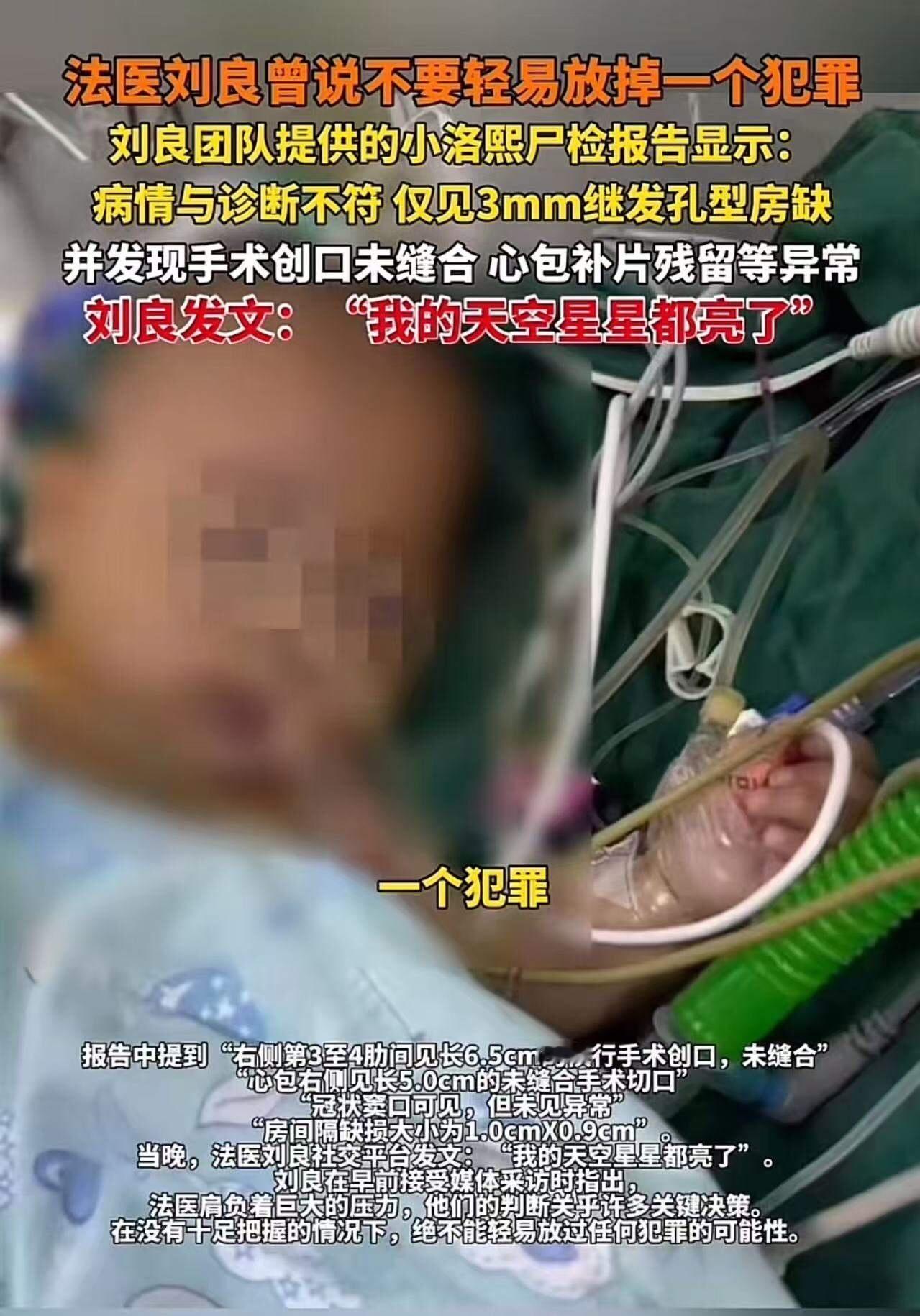 “这个妈妈的心该有多痛啊?”法医刘良团队提供的小洛熙尸检报告显示:病情与诊断不符,仅见3mm继发孔型房缺,无术前所述7mm静脉窦型房缺及无顶冠状窦综合征。也就是,这压根就不用手术,更离谱的是孩子手术后的创口居然没有缝合…… 想象一下,那个曾经满怀希望带着宝贝走进医院的母亲,迎来的是一份令人心碎的“真相”。医者本应是守护生命的天使,却在关键时刻变成了“翻车现场”。 法医刘良团队的尸检报告揭示了一个令人震惊的事实:小洛熙的病情,根本不需要手术!那只是一场“误诊”的悲剧。报告中显示,孩子仅仅有3毫米的继发孔型房缺,而诊断中所述的7毫米静脉窦型房缺和无顶冠状窦综合征,竟然完全不存在!更令人发指的是,手术后孩子的创口居然没有缝合,仿佛一场“草率的掩饰”,在生命的最后时刻留下了更深的伤口。 我们不禁要问:这样的医疗漏洞,背后隐藏着多少不为人知的黑幕?是医疗技术的失误,还是某些医务人员的疏忽?更令人疑惑的是,为什么如此明显的“错误”没有被及时发现?难道医者的责任感就如此淡漠,还是有人在利益面前选择了隐瞒真相?这不仅仅是一个家庭的悲剧,更是整个医疗行业的伤疤。 这起事件像一面镜子,折射出当前医疗体系中潜藏的种种问题——从信息不对称、责任推诿,到监管缺失、利益驱动。我们每个人都可能成为下一次“受害者”,如果不能正视问题、完善制度。 更令人愤怒的是,面对如此严重的错误,相关部门的反应似乎还不够及时。家长的呼吁、公众的关注,却似乎还未能引起应有的重视。这不仅仅是一起医疗事故,更是对生命的亵渎,是对每一个孩子、每一个家庭的深深伤害。 我们要问:生命的价值,难道可以用一份“误诊”来衡量?难道一个孩子的生命,就可以如此轻易地被“玩弄”在手心?我们必须发声,呼吁制度的完善,呼吁对医疗行业的严格监管,更要让那些所谓的“天使”明白,责任和良知不可丧失。 这起悲剧告诉我们,生命无价,不能因为一时的疏忽或贪婪,就让无辜的生命蒙受无法挽回的痛苦。我们期待一个更透明、更负责的医疗环境,也希望所有父母都能从中吸取教训,学会用最敏锐的眼睛守护自己最爱的孩子。 因为,生命的每一秒都值得被尊重,每一个孩子都应当在爱与责任中成长。而我们,作为社会的一份子,也要共同努力,让这样的悲剧不再重演。宁波妇儿小洛熙