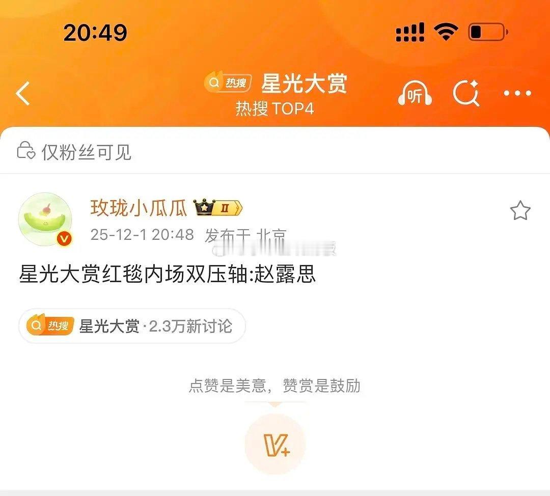 星光大赏推荐海报 星光大赏首页最新推荐页面,只有赵露思一个人,其他时候均为无人的状态。昨天,《许我耀眼》在金鹅荣誉发布收获多个大奖,许我耀眼更是获得年度剧集,大爆剧的排面就是如此有含金量。目前爆料来看,赵露思还将在星光大赏红毯以及星光大赏内场压轴出场。作为腾讯视频年冠的存在,所有好的待遇和奖项都值得啊!期待赵露思星光大赏红毯喽!