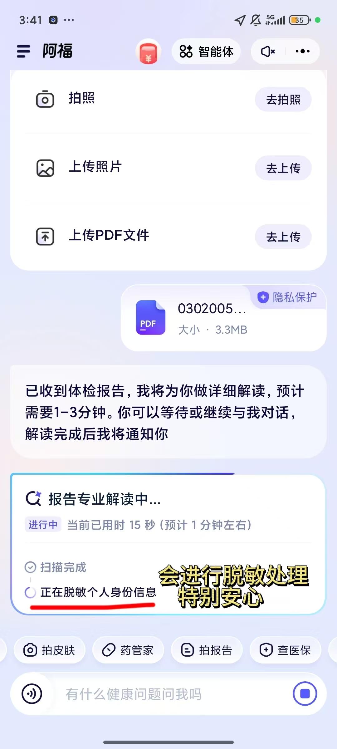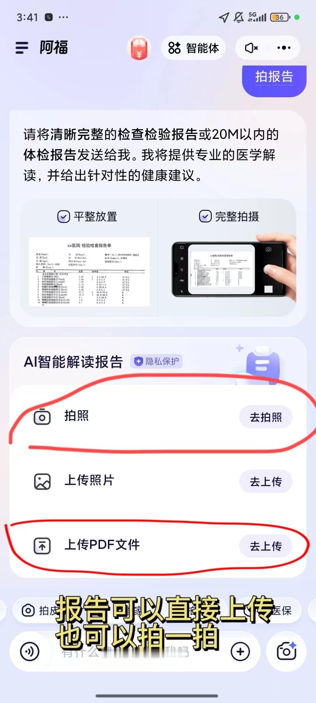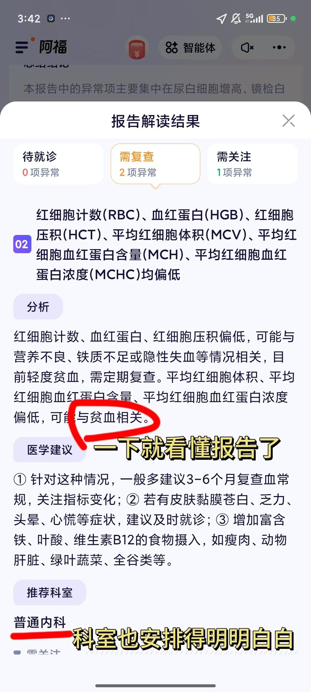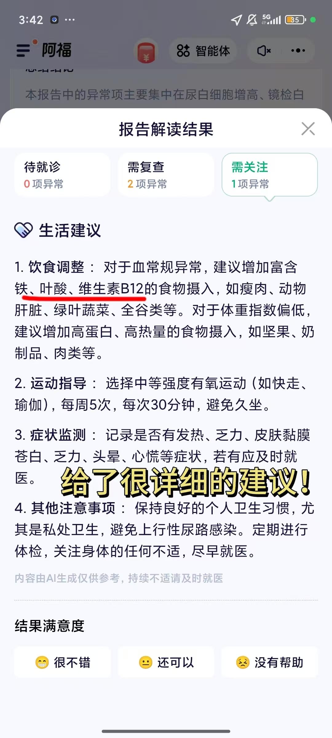 建议大家都去试试,从此看懂体检报告,再也不求人。 每次拿到体检报告,看到上面密密麻麻的专业术语和各种箭头,很多人可能都会感到有些困惑。我之前也是如此,不清楚具体指标代表什么,也不知道哪些问题需要特别注意。 今年体检完,我养成了一个习惯,收到报告,先打开阿福app,拍给他看。 首先,它的解读很细致,容易理解。 比如,报告上显示我的“红细胞计数(RBC)”和“血红蛋白(HGB)偏低,它会直接解释这可能意味着“轻度贫血,与营养或铁质摄入不足有关”,这样我就不用自己再去查这些术语了。 它还会将异常项分类,比如「待就诊」、「需复查」、「需关注」。在我的报告里,有2项被标记为需复查,1项需关注,可以分别点击,让我能立刻抓住重点。 其次,给出的建议很具体,也很好执行。 阿福建议我在3-6个月后复查血常规,可以适当多吃一些瘦肉、动物肝脏和绿叶蔬菜,平时可以进行快走等适度运动。如果出现乏力等症状要及时就医,还给我推荐了适合的科室 最后,它还有一些对日常生活有帮助的功能。 除了报告解读,这个应用还可以用来记录饮食、定制健康方案等。我用它来记录日常热量,家人也可以用它来辅助管理饮食,对全家人的健康管理都有一定的帮助。 总的来说,有了这个工具,面对体检报告时心里能更有数,也不容易因为不了解而过度焦虑。当然,它只是一个辅助参考工具,如果身体有严重不适,还是一定要及时去医院看医生。