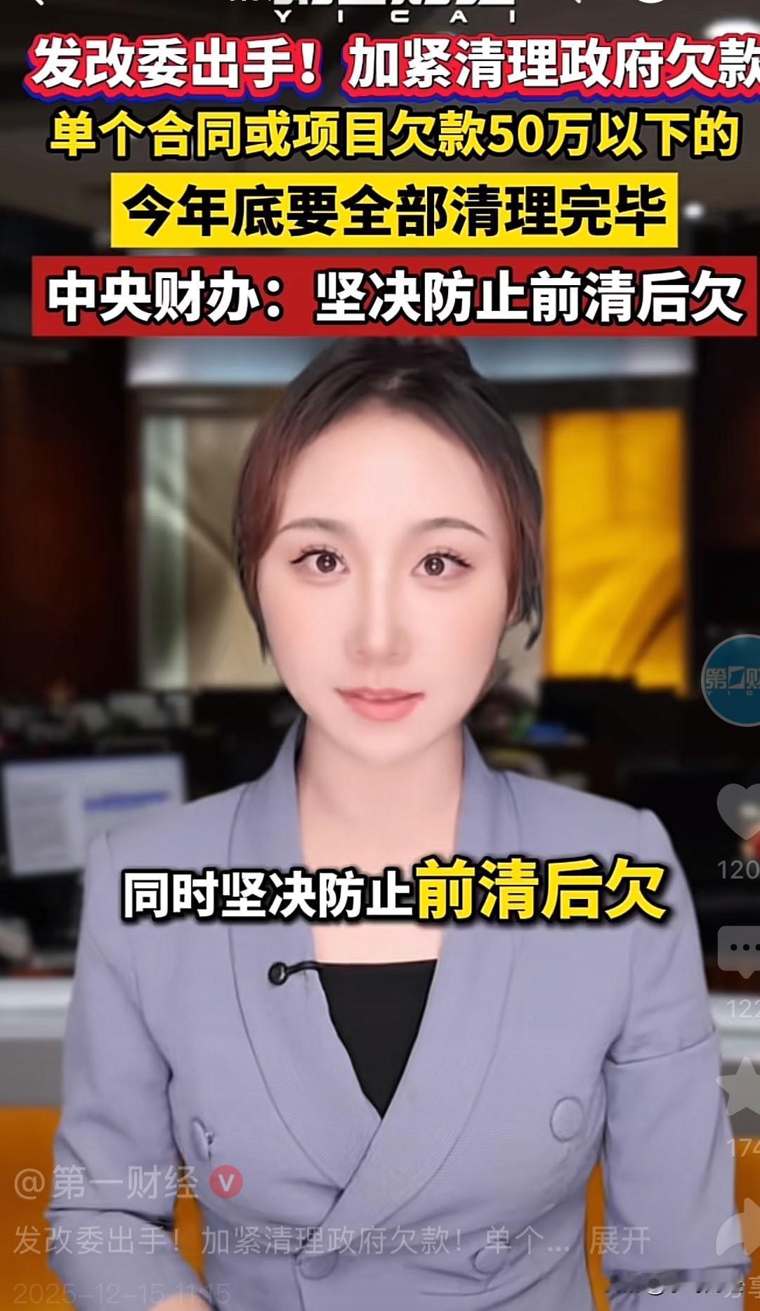 本年结束前,对单个合同或项目欠款50万以下的,对私营中小企业的,必须全部还清。 许多人不知道为什么是50万以下要全部出清,这应该是快速审批程序。 个人猜测50万以下的金额,应该不用进入“三重一大”决策清单吧! 而26年实施积极财政,首要任务应把拖欠中小企业主的钱先还了。 有些央国企业也没钱,尤其是建筑业,怎么办? 由财政补贴利息,先向银行贷款先行支付。 至于实在是经营不景气的,该破产清算就破产清算,久拖不决也不是事儿。