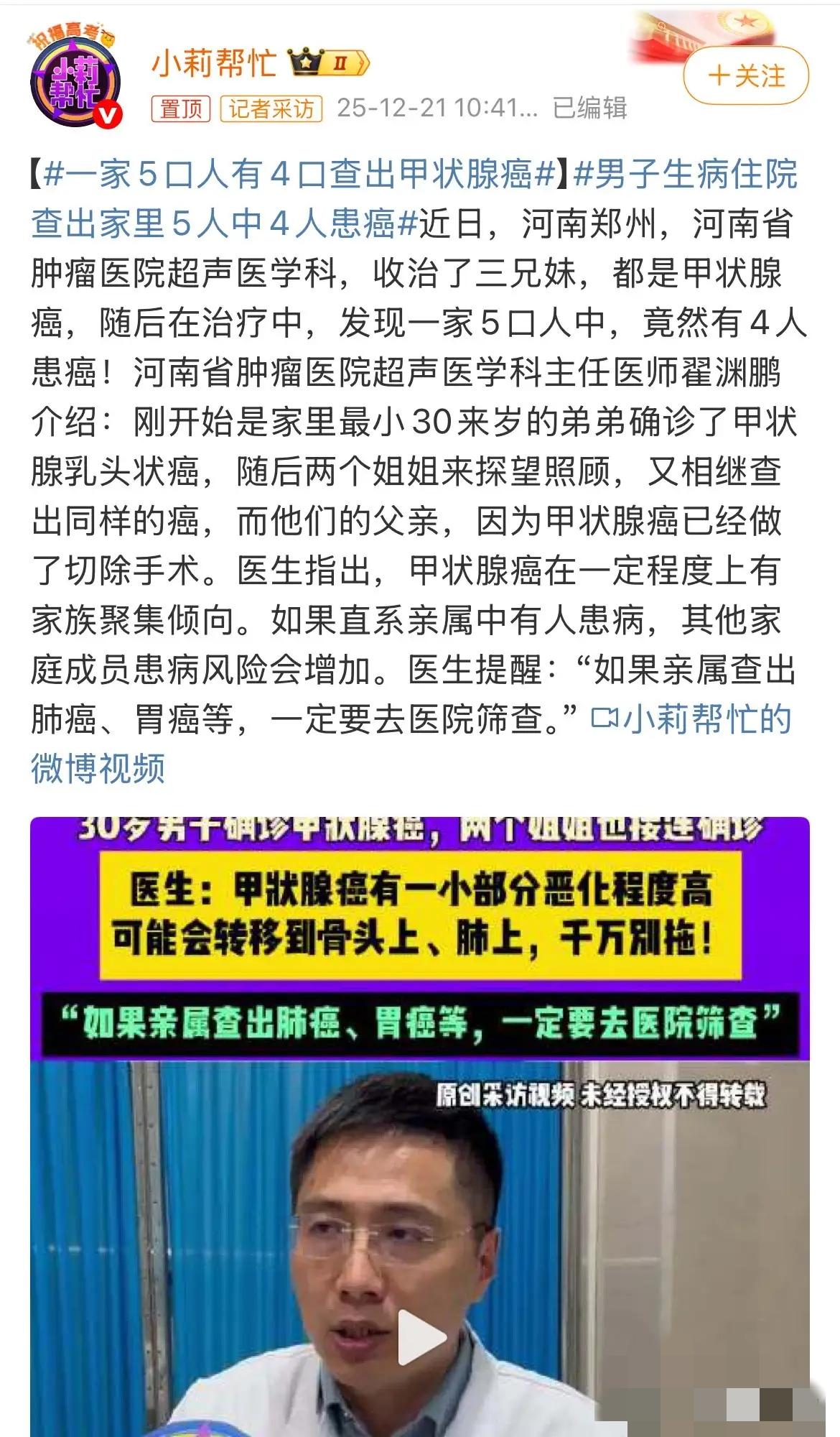 揪心!河南一家5口4人患癌,3兄妹接连确诊同一种癌,医生:2个诱因比遗传更致命! 河南郑州一个普通家庭,遭遇了毁灭性的健康打击!30岁弟弟体检发现甲状腺结节,进一步检查确诊甲状腺乳头状癌,没想到两个姐姐赶来陪护时筛查,竟也查出同款癌症——更让人揪心的是,他们的父亲早已因甲状腺癌做过切除手术,一家5口4人患癌,瞬间被阴霾笼罩! 这不是个例!河南省肿瘤医院医生透露,临床中这类“家族聚集性癌症”越来越常见:有祖孙三代都患食管癌的,有夫妻先后确诊肺癌的,还有全家多人中招胃癌的,背后的原因远比想象中复杂,却也给所有人敲响了警钟。 医生直言,家族多人患癌,绝非单一因素导致,而是“遗传倾向+共同生活习惯”的双重叠加: - 遗传是“先天隐患”:甲状腺癌、乳腺癌、结直肠癌等都有明显家族聚集倾向,直系亲属中有3人及以上患病,风险会比普通人高5-10倍,部分还与RET、BRCA等基因突变相关; - 生活习惯是“致命推手”:这家人长期同吃同住,高油高盐饮食、熬夜、情绪压抑等习惯高度一致,再加上可能共同暴露的环境因素,让癌细胞有了可乘之机。就像另一对50岁夫妻,无血缘关系却同时患癌,追溯原因竟是30年熬夜、吃外卖、频繁争吵的结果! 更关键的是,4种癌症最容易“家族抱团”,一定要警惕: 1. 甲状腺癌:家族中有人患病,其他成员要定期做甲状腺超声; 2. 胃癌:长期吃腌制品、共用餐具感染幽门螺杆菌,都是家族共患诱因; 3. 结直肠癌:高脂肪低纤维饮食+便秘,会让全家风险飙升; 4. 肺癌:二手烟、厨房油烟是“家庭共患”的主要元凶。 医生给出的3个防癌建议,家家都该照做: - 有家族史必做专项筛查:直系亲属患癌,提前10年开始筛查(比如结直肠癌25岁起做肠镜,甲状腺癌每年查超声); - 改掉“全家共有的坏习惯”:减少腌制品、高油高盐食物,厨房做好通风,少熬夜、少争吵,情绪舒畅能降低30%患癌风险; - 定期做基因检测:若家族多人患同一种癌,建议做遗传基因筛查,提前干预风险。