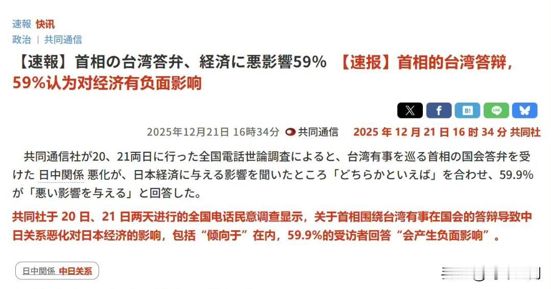 日本共同社民调,59.9%的受访者认为,高市早苗的涉台言论,将对日本经济产生负面影响。 评论区有的大骂共同社“反日”,也有不少人对高市早苗的高支持率表示不理解。