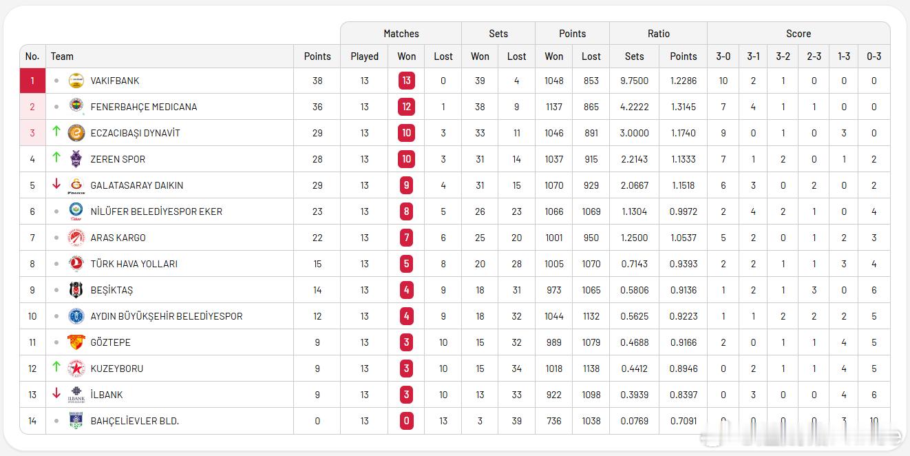 📊 土超女排联赛常规赛上半程结束,瓦基弗银行队以13战全胜战绩领跑积分榜;加拉塔萨雷暂居第5位。常规赛下半程比赛将于1/3日开打。