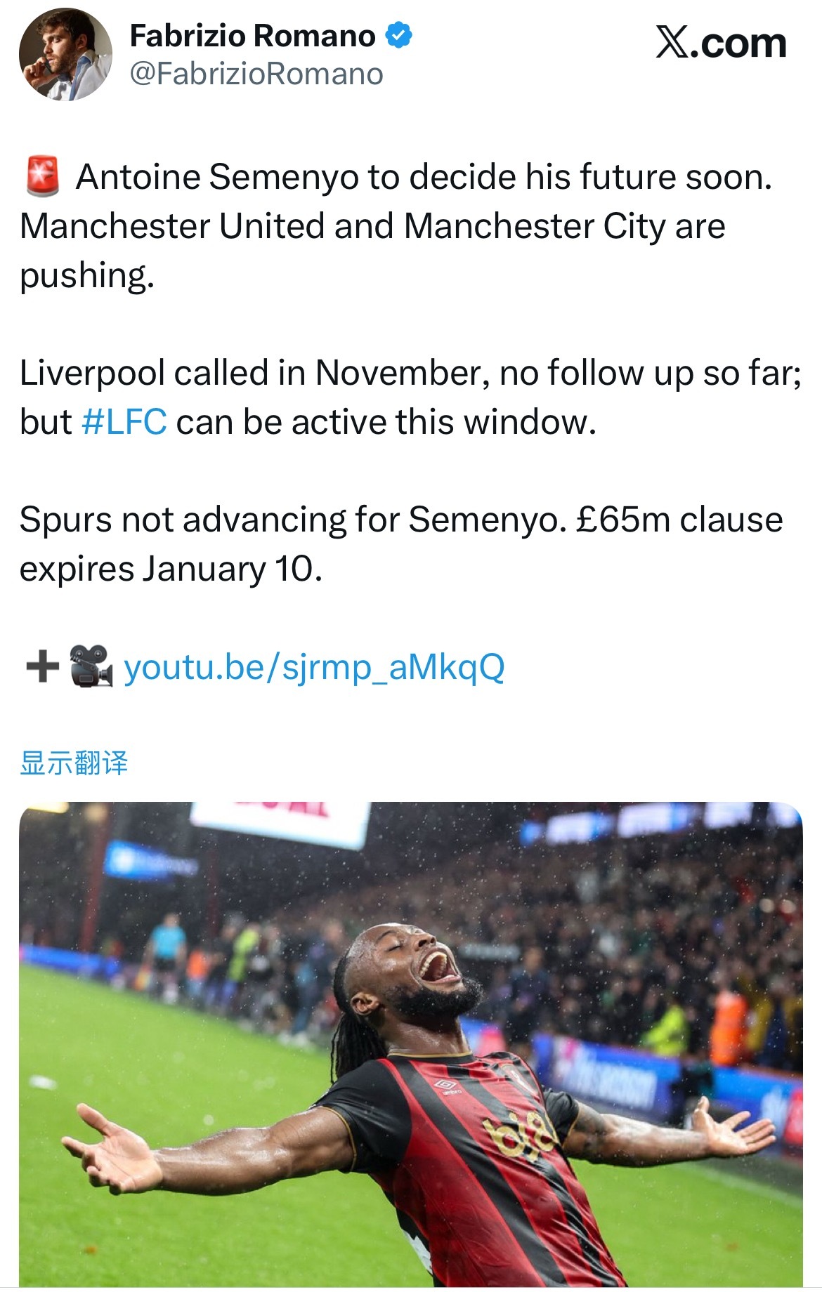 根据包括罗马诺在内多名记者的报道,塞梅约有相当大概率在冬窗完成转会,包括曼联曼城利物浦热刺在内多家英超俱乐部都有意,塞梅约即将决定他的未来。6500万英镑的违约金条款将于2026年1月10日后失效。如果转会在这个时间点左右完成,那么,1月4日阿森纳客场对阵伯恩茅斯的比赛将是他的告别战。