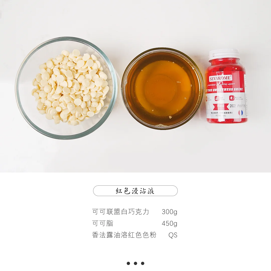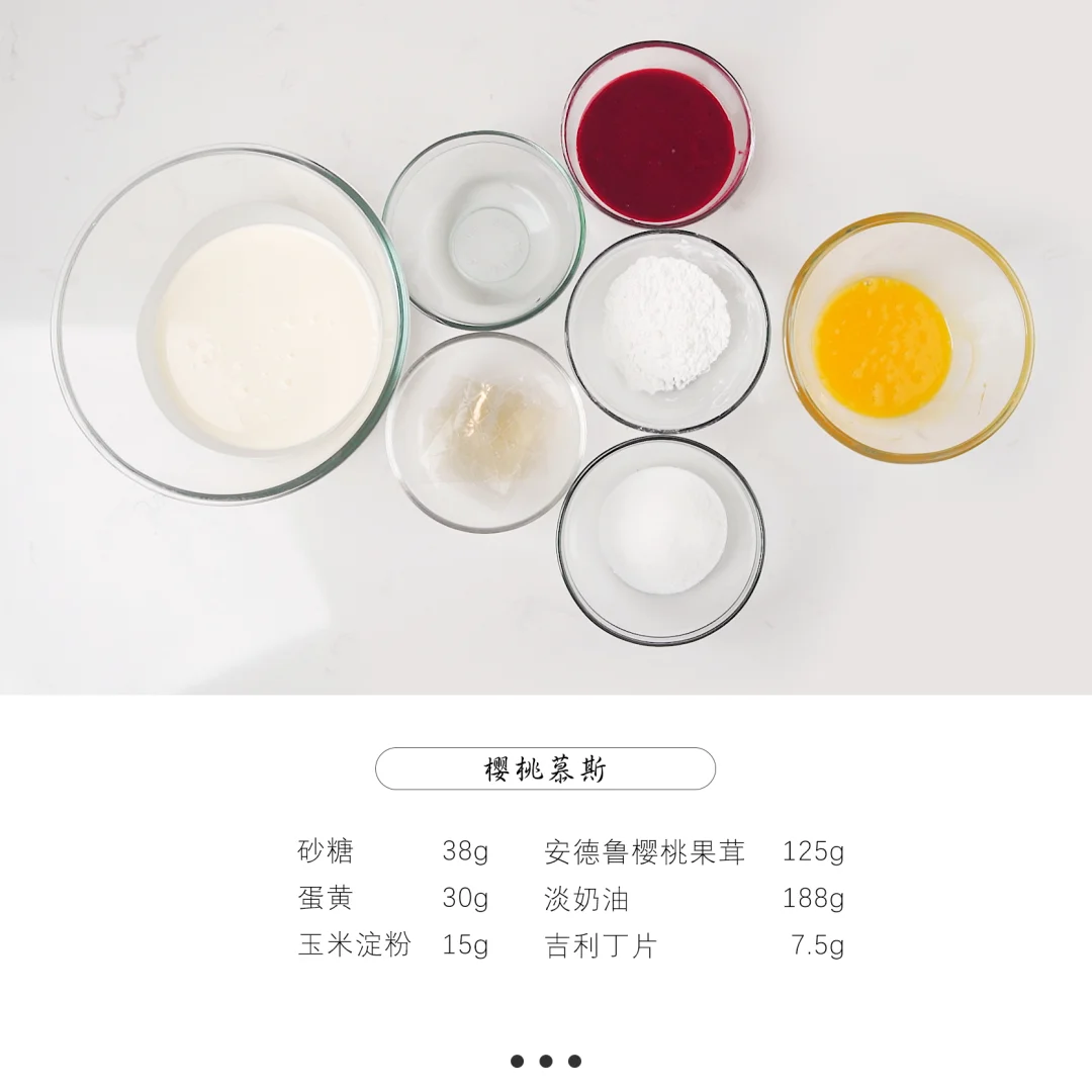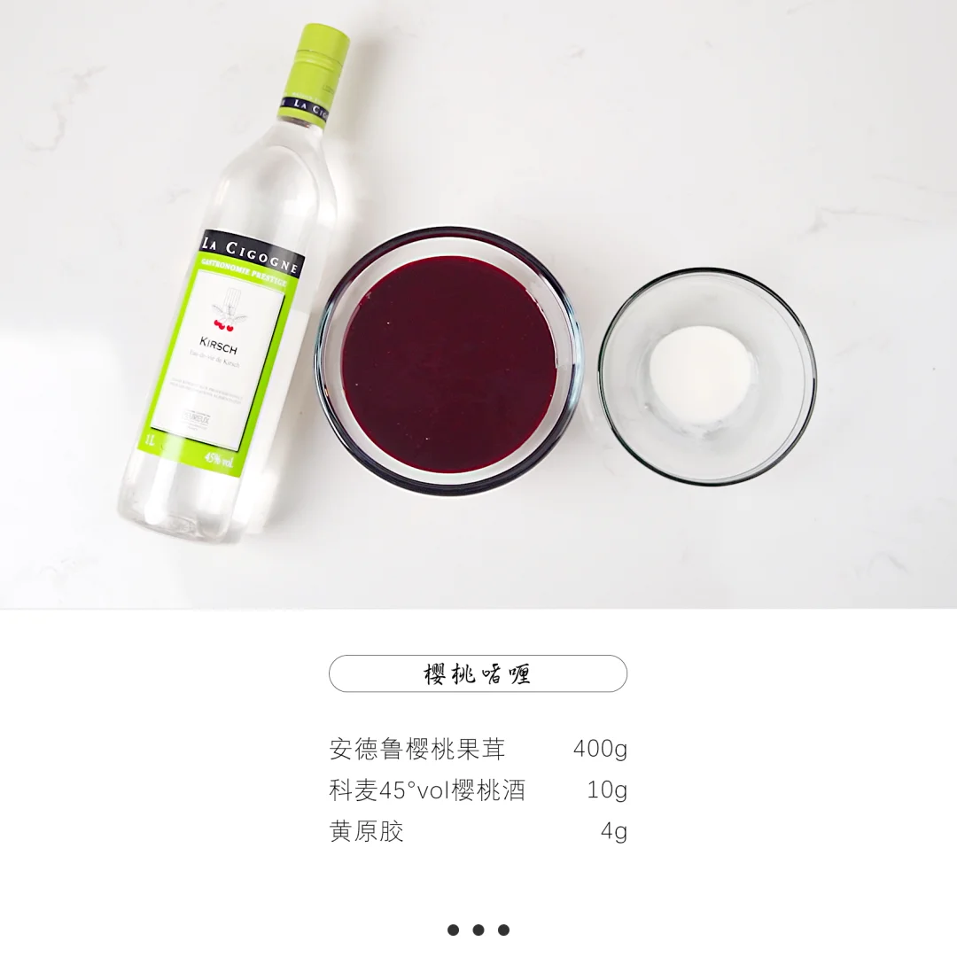 . 🍒年底了又到了各种车厘子含量高高的时候了,今天安排上一款仿真车厘子,会流心的,少糖怕甜星人放心冲[吧唧R] . 🍒配方看图上哦 . 🍒 注意点 1⃣️樱桃流心 1、常温樱桃果茸和黄原胶用均质机打匀,再加入樱桃酒搅拌均匀。 2、300克新鲜樱桃去核切成丁,然后与400克樱桃啫喱搅拌均匀。 3、注入15连半圆模具,抹平后冷冻至不粘手,再将两半粘合成球,放入冰箱冷冻冻硬。 . 2⃣️ 樱桃慕斯 1、蛋黄搅拌成蛋液后,依次加入砂糖和玉米淀粉搅拌均匀。 2、加入常温樱桃果茸搅拌均匀,倒入锅中以中小火搅拌加热,煮至稠状离火,可用胶刮进行划线测试。 3、整体均匀过筛,加入吉利丁搅拌均匀。 4、淡奶油打发至5成,再与步骤3的慕斯基液翻拌成均匀的慕斯液。 . 3⃣️ 红色浸沾液 可可脂和白巧克力分别融化后倒入量杯,再加入适量红色色粉,用均质机乳化至顺滑。 . 4⃣️ 透明披覆 葡萄糖浆和清水混合加热,加热至锅底冒泡后加入砂糖和卡拉胶的混合物,继续搅拌加热煮至沸腾,并保持沸腾2-3分钟收稠离火,降温后使用。 . 5⃣️ 樱桃把&成品组装 1、将慕斯液注入8连樱桃模具中,放入冻硬脱模的夹心球,抹平慕斯液后放入冰箱冷冻冻硬。 2、脱模后进行红色浸沾,浸沾温度为30-35°C,放入冰箱冷冻3小时。 3、取出后进行透明淋面的浸沾,浸沾温度30-35°C。 4、装饰上樱桃把,樱桃把的制作:黑巧克力用破壁机搅打成泥,揉搓成樱桃把,再用调温后的巧克力在樱桃把的顶部裱挤成环状,结晶后筛上适量的可可粉。(巧克力操作用量300克) . 🍒今天的制作就到这里啦,过年放假就给自己安排上~