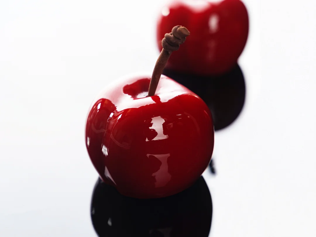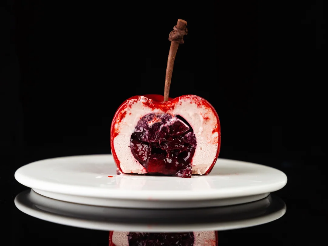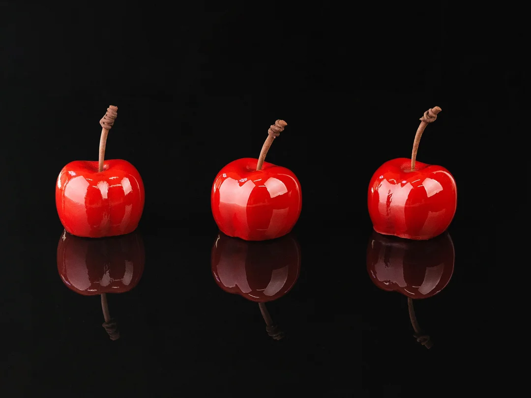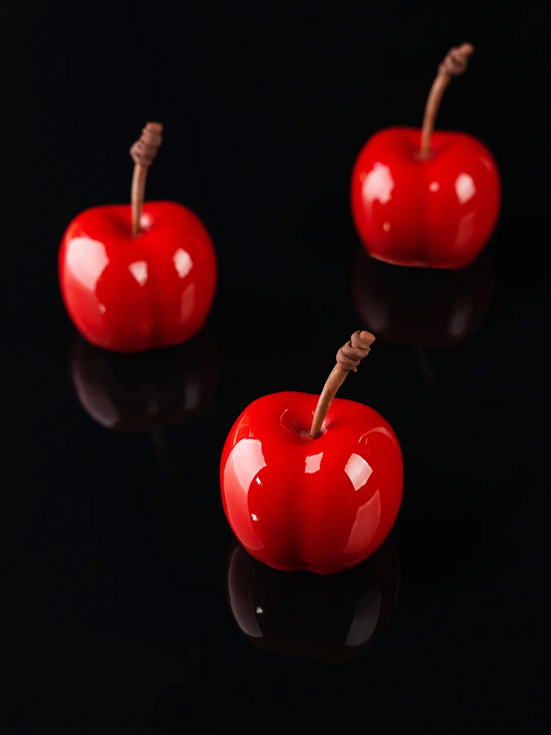. 🍒年底了又到了各种车厘子含量高高的时候了,今天安排上一款仿真车厘子,会流心的,少糖怕甜星人放心冲[吧唧R] . 🍒配方看图上哦 . 🍒 注意点 1⃣️樱桃流心 1、常温樱桃果茸和黄原胶用均质机打匀,再加入樱桃酒搅拌均匀。 2、300克新鲜樱桃去核切成丁,然后与400克樱桃啫喱搅拌均匀。 3、注入15连半圆模具,抹平后冷冻至不粘手,再将两半粘合成球,放入冰箱冷冻冻硬。 . 2⃣️ 樱桃慕斯 1、蛋黄搅拌成蛋液后,依次加入砂糖和玉米淀粉搅拌均匀。 2、加入常温樱桃果茸搅拌均匀,倒入锅中以中小火搅拌加热,煮至稠状离火,可用胶刮进行划线测试。 3、整体均匀过筛,加入吉利丁搅拌均匀。 4、淡奶油打发至5成,再与步骤3的慕斯基液翻拌成均匀的慕斯液。 . 3⃣️ 红色浸沾液 可可脂和白巧克力分别融化后倒入量杯,再加入适量红色色粉,用均质机乳化至顺滑。 . 4⃣️ 透明披覆 葡萄糖浆和清水混合加热,加热至锅底冒泡后加入砂糖和卡拉胶的混合物,继续搅拌加热煮至沸腾,并保持沸腾2-3分钟收稠离火,降温后使用。 . 5⃣️ 樱桃把&成品组装 1、将慕斯液注入8连樱桃模具中,放入冻硬脱模的夹心球,抹平慕斯液后放入冰箱冷冻冻硬。 2、脱模后进行红色浸沾,浸沾温度为30-35°C,放入冰箱冷冻3小时。 3、取出后进行透明淋面的浸沾,浸沾温度30-35°C。 4、装饰上樱桃把,樱桃把的制作:黑巧克力用破壁机搅打成泥,揉搓成樱桃把,再用调温后的巧克力在樱桃把的顶部裱挤成环状,结晶后筛上适量的可可粉。(巧克力操作用量300克) . 🍒今天的制作就到这里啦,过年放假就给自己安排上~