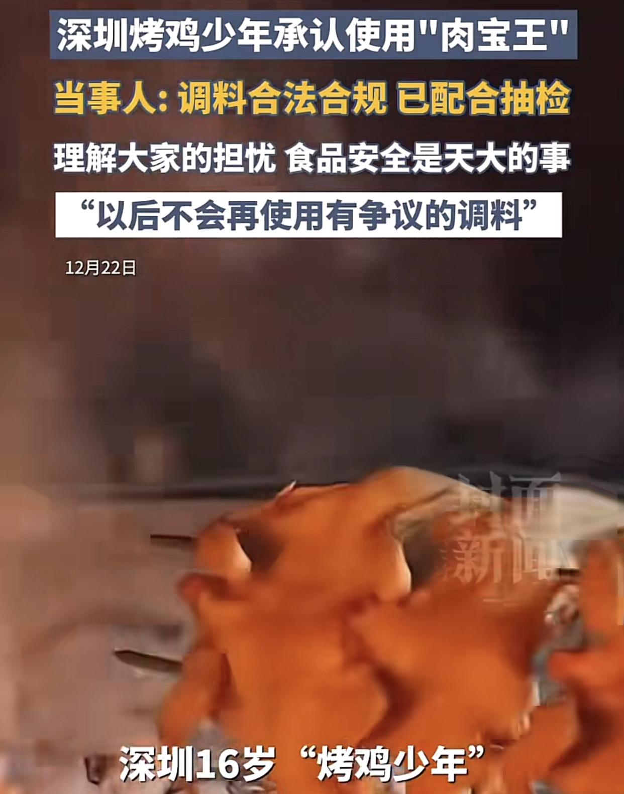“以后不会再用这些有争议的调料品了!” 深圳坂田“少年烤鸡店”16岁店主,近日被发现烤鸡用“肉宝王”腌制遭到炮轰!这类复合调味料并非禁用,也不只有食品厂才能使用。餐饮店,家庭都可使用,不过要遵循要求,比例放多放少这个不好掌握。 “少年烤鸡”店用来腌制,取决于他进的鸡到底是什么品种的鸡,如果几个月出栏的冰鲜鸡,不用调料,这种鸡没一点鸡味。人家就是赚钱,深圳这种路边摊做烤鸡的不止他一个,冰冻鸡十几二十块钱一只,卖68、78、88都有。自己在家做饭没有外面做好吃的,原因是调味料太简单了,单单放油盐也可以出好味道,前提是必须得是当天现杀的鲜鸡。(来源:封面新闻) 还是太年轻了,不懂什么“事以密成,言以泄败,树大招风,闷声发大财!”才16岁,能做到这样已经不错了,别鸡蛋挑骨头了。