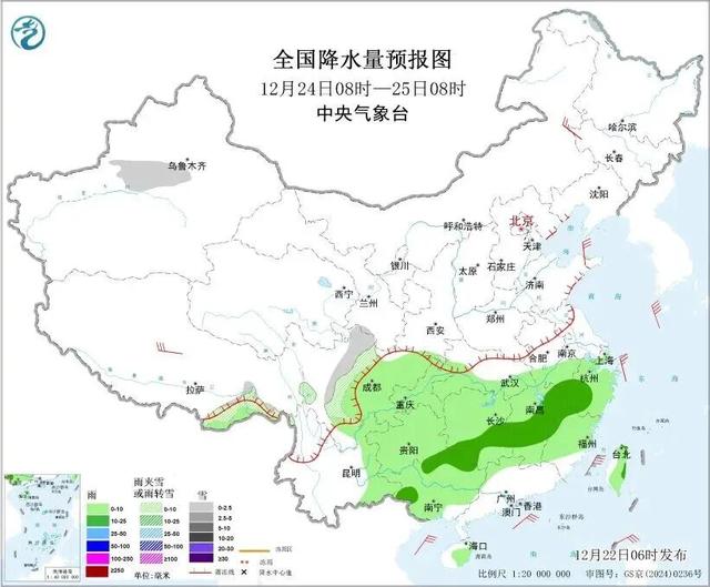 中央气象台预计,12月22日至25日,陕西南部、黄淮、西南地区东部、江汉、江淮、江南、广西等地有小雨、局部中雨;甘肃、内蒙古、华北,东北地区等地有小到中雪或雨夹雪,东北地区的部分地区有大雪,局地暴雪。
