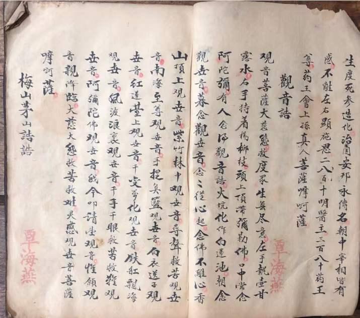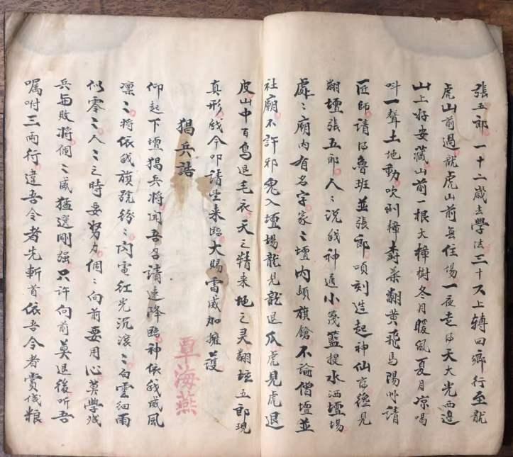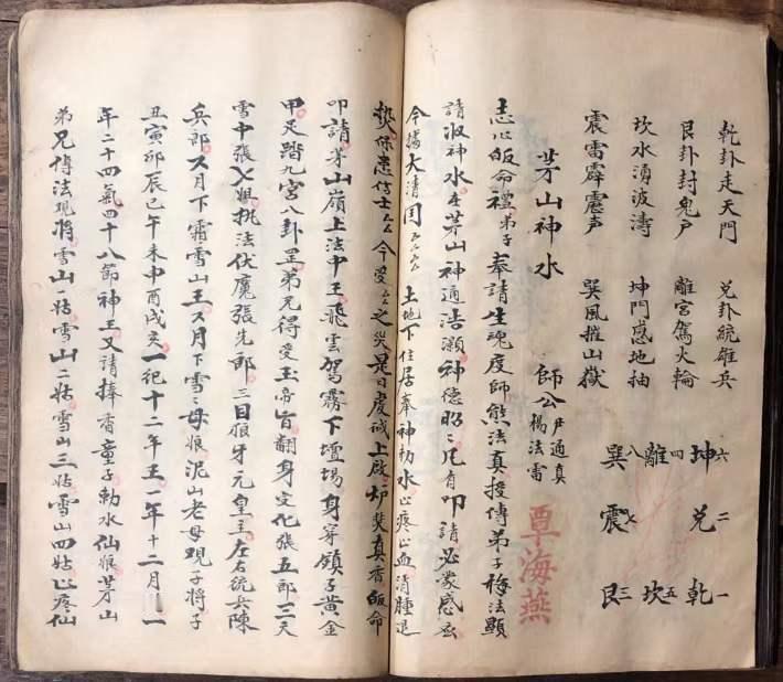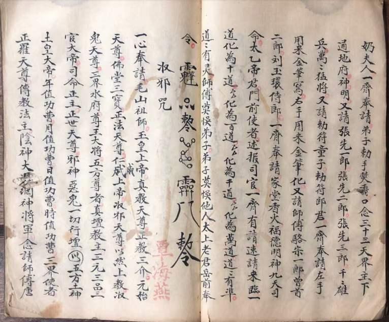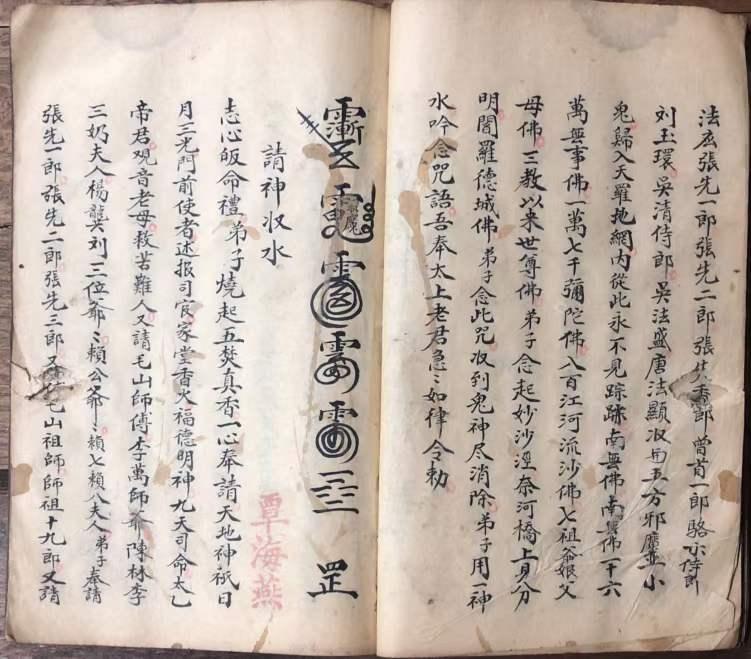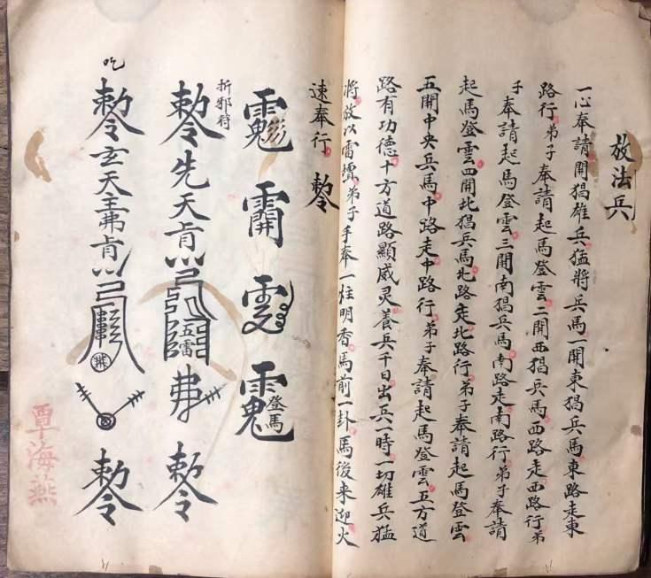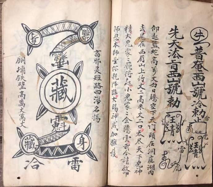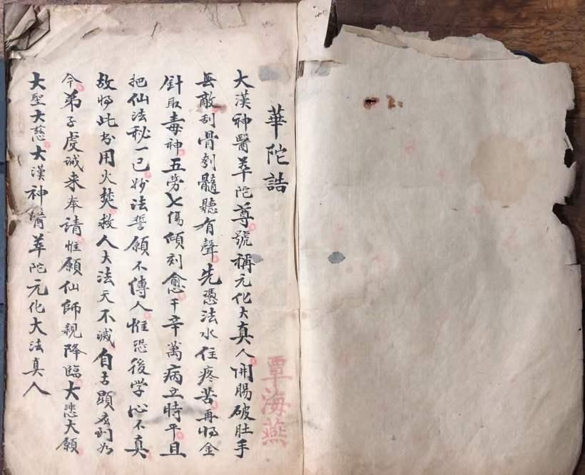 《华陀符咒本》,清代民间手抄本,梅山真传道医秘本,内窖有,华佗诰,药王诰,观音诰,梅山茅山诰,祖师百字诰,杨泗诰,元皇诰,翻壇诰,猖兵诰,五猖诰,永和真人诰,请五郎出门,雪山神水,二用收毛山灵水,敕符水,收邪咒,请神收水,收兵咒,放法兵,谢水咒,止疼水,阳扇告,菩庵咒,茅山神水,观音水,华佗祖师水,阳扇法告,止血水,华