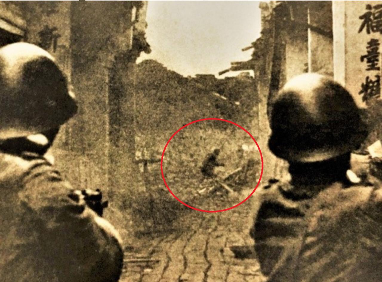这不是电影画面,也不是拍戏镜头,而是日军摄影师镜头下的真实照片。这是一位在日军枪口之下命悬一线的中国士兵,如图中所示的红圈处。这位中国士兵胆子很大,在巷战中依然能从这头跑到那头。然而,此时此刻,两个日军已经举起枪瞄准了他!日军摄影师也刚好举起相机拍下了这张照片。照片后面没有备注此人的命运,但是此时的他已命悬一线,但愿他能避开日军的子弹。