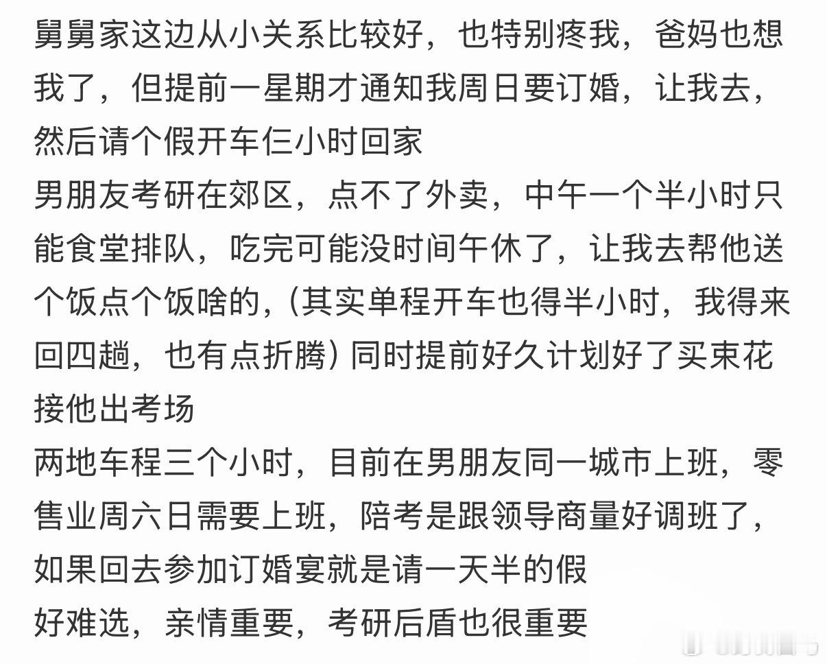 表哥订婚宴和男朋友考研陪考,赶一天了,选哪个