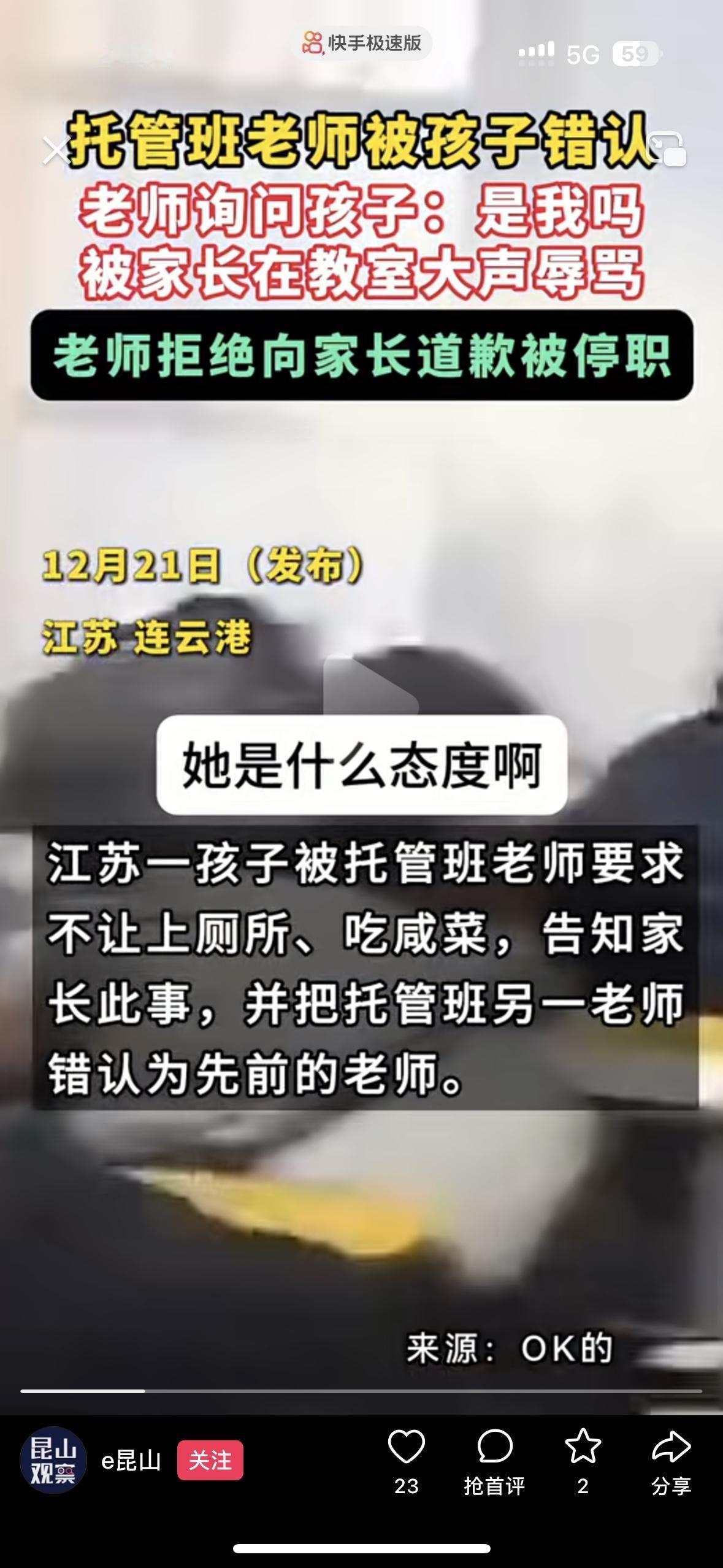 跪着的老师教不出站着的学生!什么时候家长能这么颠倒黑白。自己孩子说在托管班不让上厕所,吃咸菜。家长心疼孩子跑到托管班,认错了老师并把老师大骂一顿 在知道自己骂错人后,还理直气壮的说就是骂的你,你不配为人师表!不仅如此,领导还要求她去给家长道歉,不道歉就被停职!明明没做错却还要给家长道歉,这样的权责失衡造成老师的尊严全无,真的合适吗?