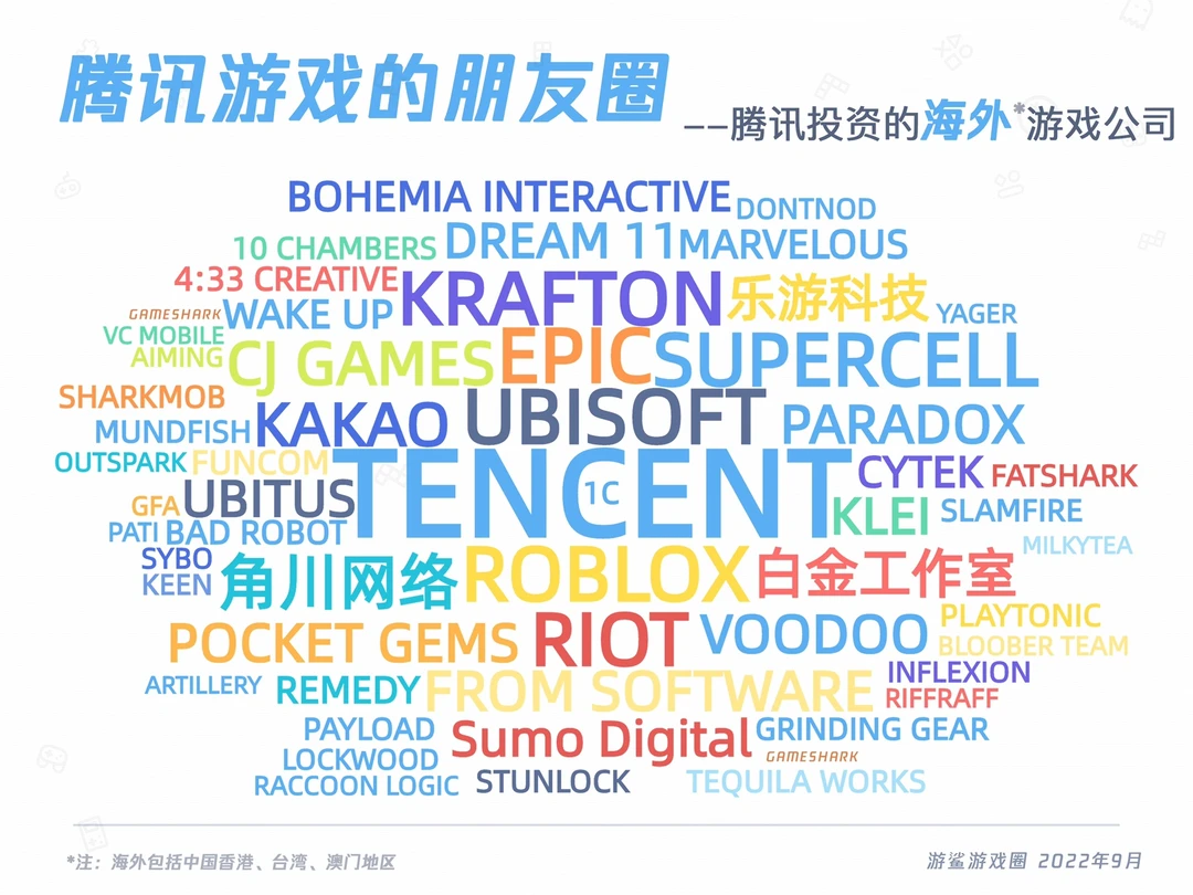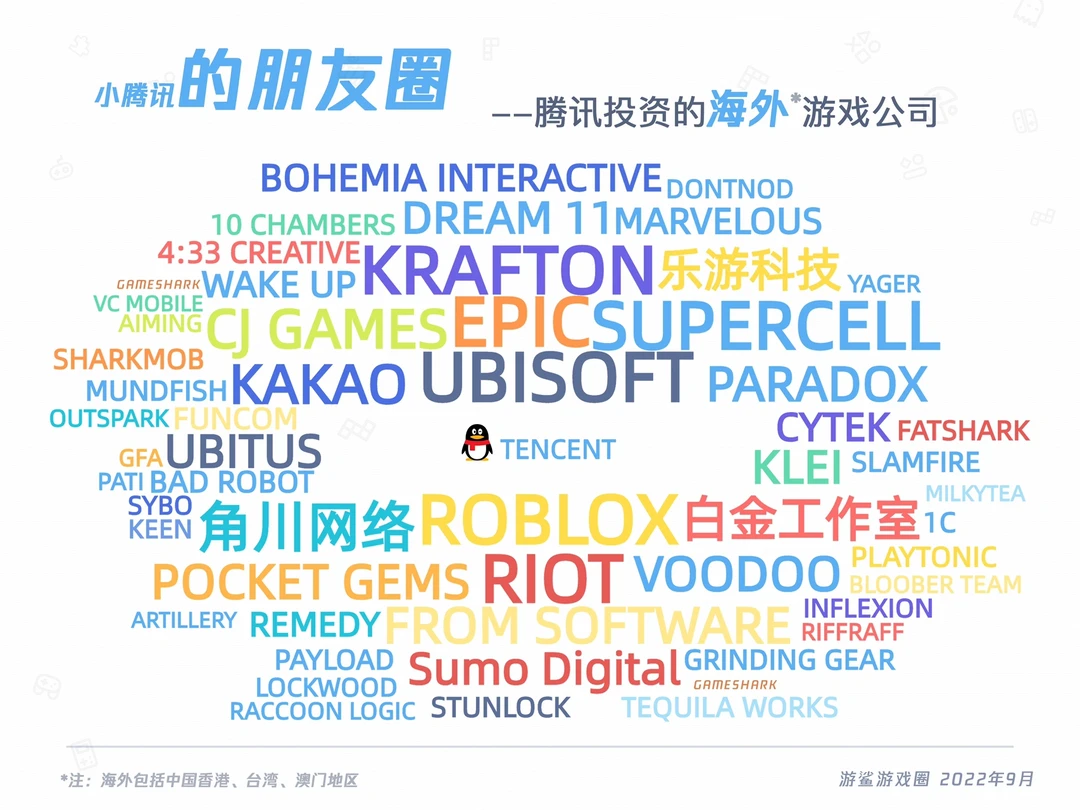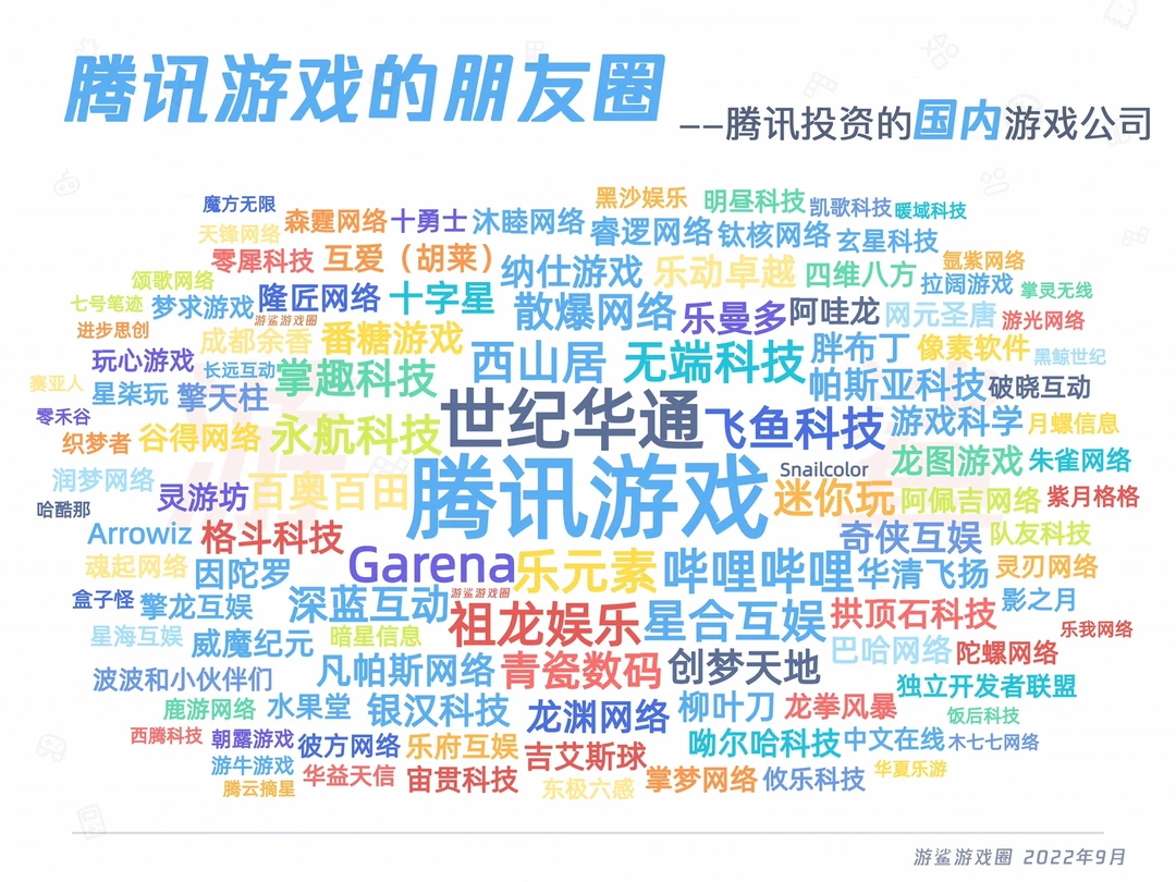 游戏公司 游戏行业 腾讯游戏 腾讯近20年投资的游戏公司,包括国内和海外,共计180余家。 不包括之前投资,现已退出的标的公司; 部分公司已经倒闭或接近倒闭(根据工商信息、官网和活跃度判断),国内有16家,海外有1家,即图上字号最小的公司。