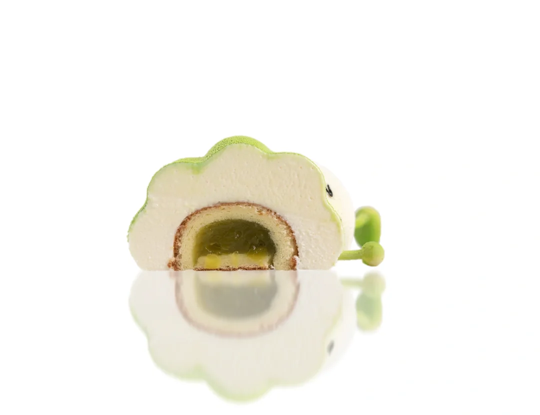 3、慕斯脱模打磨后先进行整体白色喷砂上色,再喷涂一层浅绿色喷砂液,最后再喷涂一层绿色可可脂。