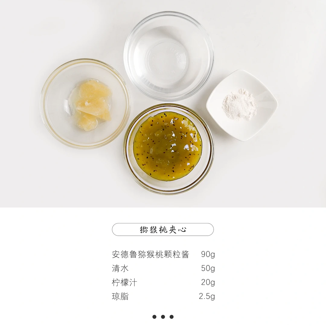 1、将6*8cm的蛋糕片放入AKOKO9连半圆柱长条硅胶模具里,再裱挤入猕猴桃啫喱,顶部放上2*8cm的蛋糕片压实后冷冻冻硬,脱模后切割成6cm长度。