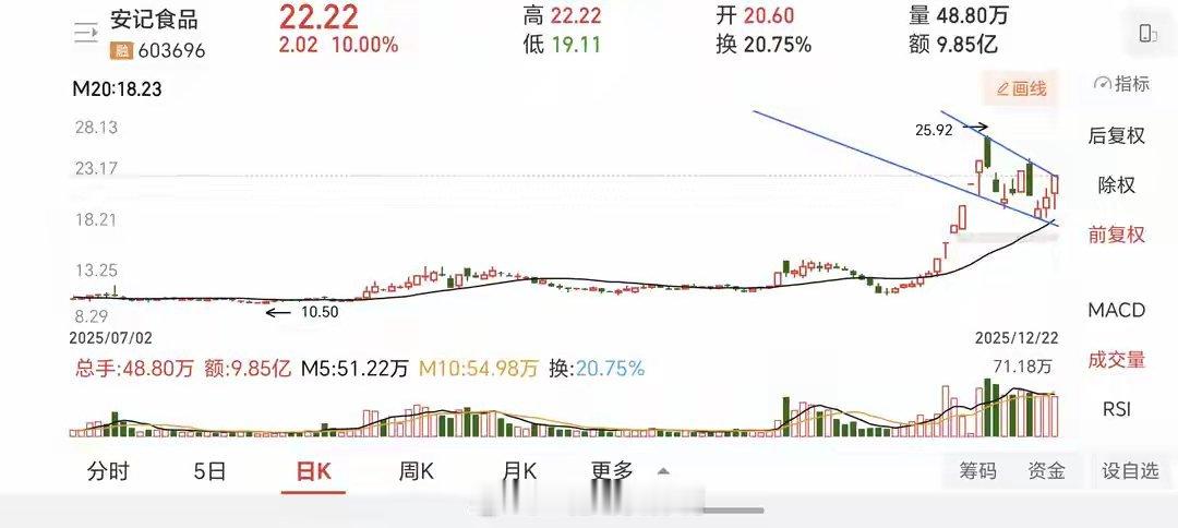 安记食品,通道走势安记食品走通道调整,下降通道常常有反弹,反弹无法突破26.49元,则成为M顶。成为大牛股二波的走势必须急跌缓涨,安井食品显然不符合。可能需要调整至少两个月。