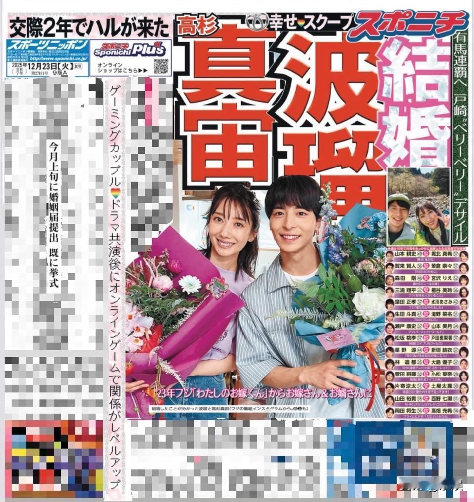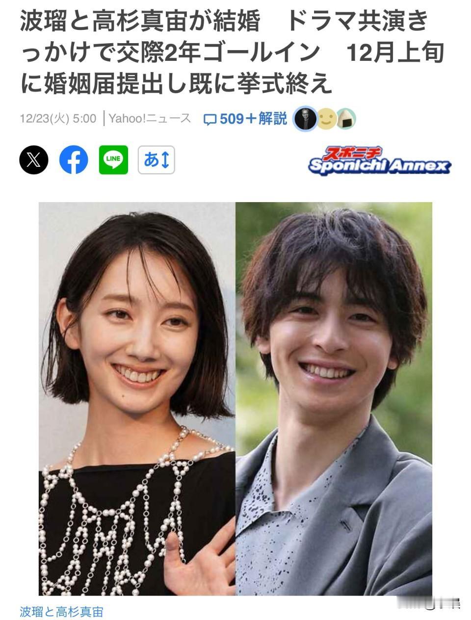 波瑠、高杉真宙结婚了,交往两年! 南波镏 新木优子 这些年日剧女神都嫁作人妇.......[泪奔] 颜值算登对了, 高杉真宙 长的很不错就是个子稍微矮一点,终于不是嫁给搞笑艺人这种了…[泪奔] 波瑠 演技一般但主打一个勤奋,不知道结婚后还会不会继续努力下去(还是祝福这一对吧)[泪奔]高杉真宙 波瑠