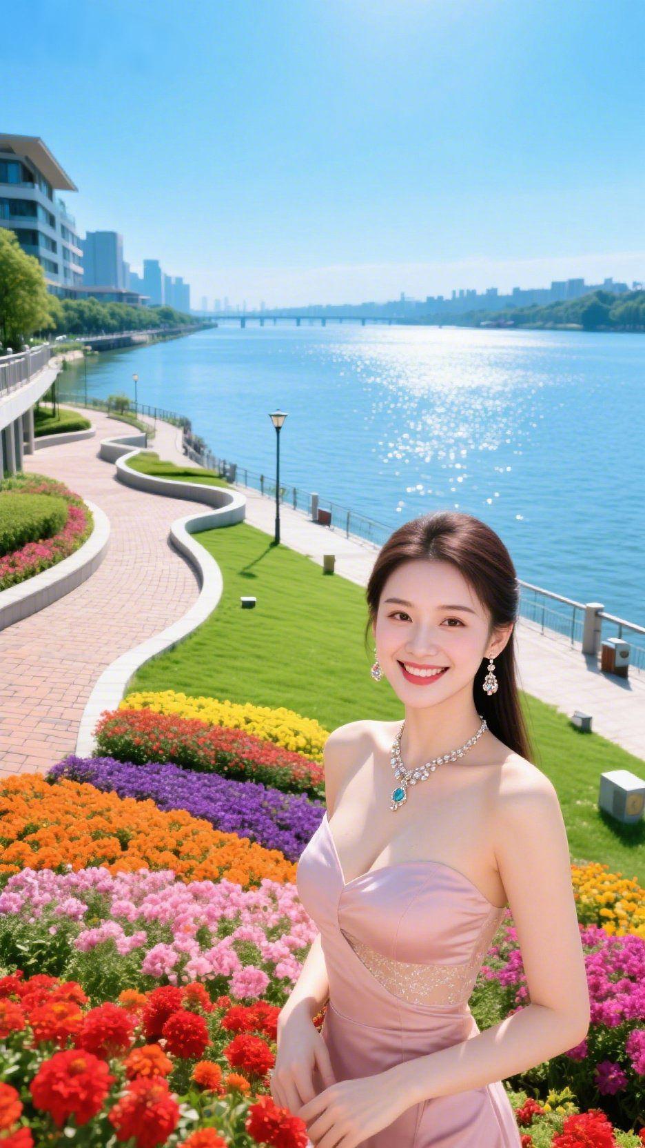 粉裙映江花绚烂 江畔的晴空蓝得透亮,粼粼波光在江面铺成碎金,五彩花海沿着步道层层绽放,红的热烈、粉的娇柔、紫的雅致,织就了一幅鲜活的春日画卷。一袭藕粉礼裙立于花海间,缎面的质感揉进了温柔的光,颈间的饰品添了几分精致,与江风、繁花相映成趣。 唇角扬起的笑意像盛着春日的暖阳,澄澈又明媚,仿佛将江畔的美好都揉进了眉眼。生活的浪漫,本就藏在这般与自然相拥的瞬间,无需刻意雕琢,一抹柔粉便让日常多了几分诗意。这份江畔花海的美好,恰似一阵春风,吹开了心底的温柔,只留满心欢喜与对生活的热爱。 江畔花海景致 粉色礼裙分享
