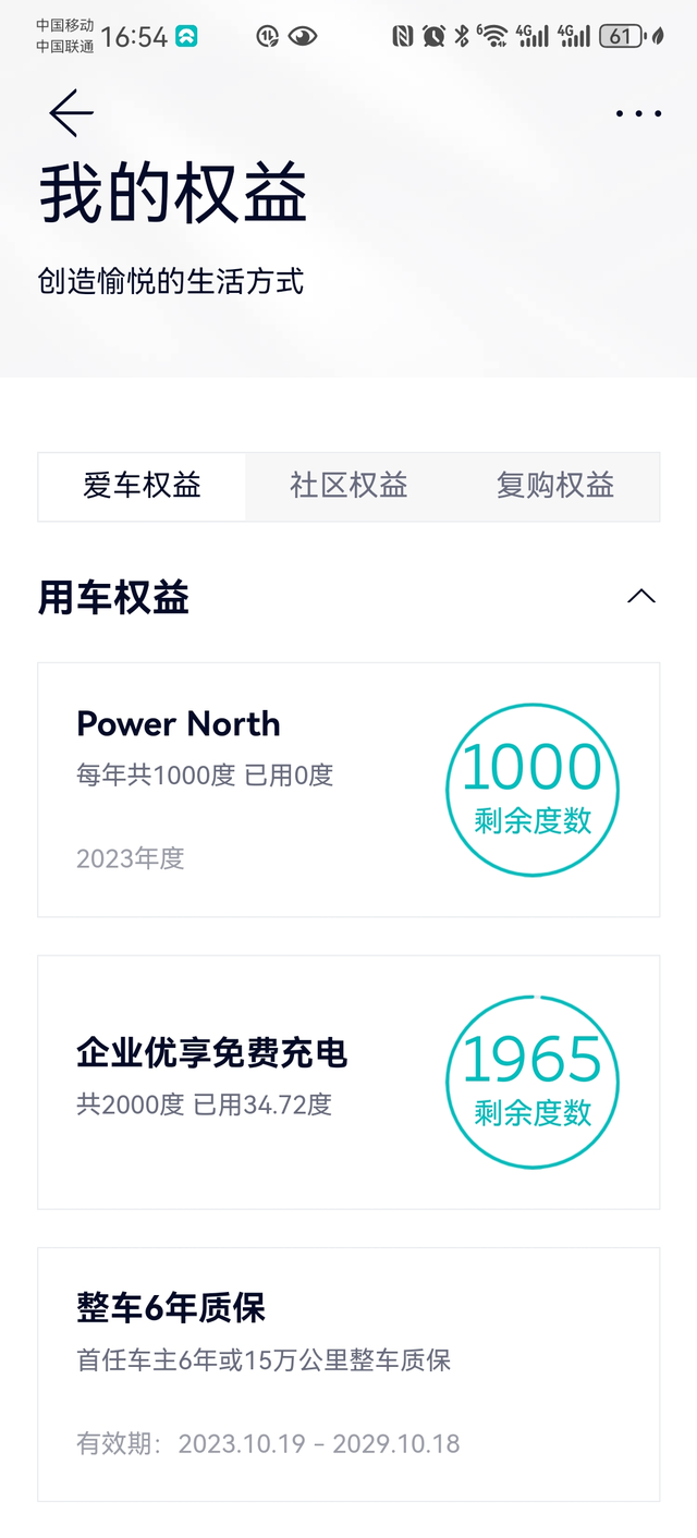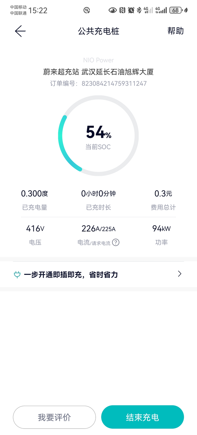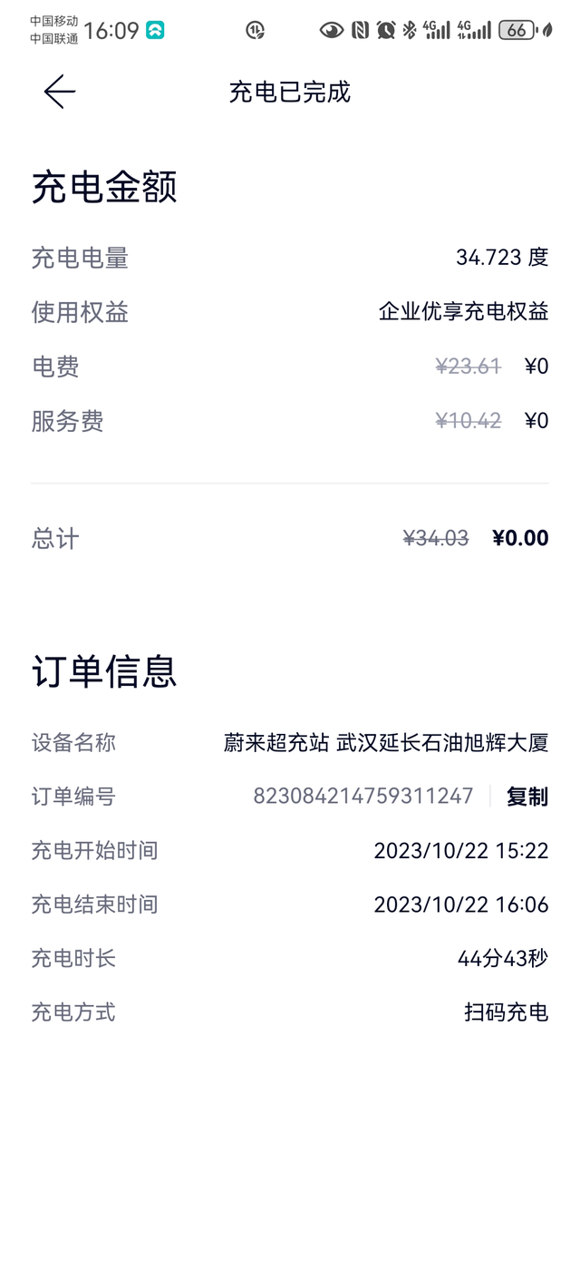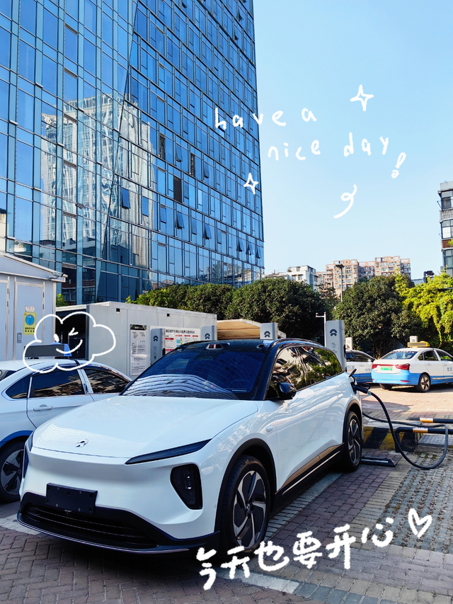 体验首次加电 已申请2000度大客户的免费用电权益,按每月200度电使用来算,可以用10个月。订车送的30次换电权益直接抵扣了车款3000元,待免费用电权益使用完后就体验换电。 找到离家附近的蔚来超充站,0.98元/度,还送两个小时免费停车,价格挺实惠。 打开手机蔚来app,进入用电权益,点击使用,扫码提枪,插入车辆快充口,提示充电中,完美。操作过程简单,也没有那么复杂,充满电,手机马上会收到提示。 从54%电量🔋到100%,充电34.7度,一共用时44分钟,感觉还可以,一边快充,一边听歌小憩。