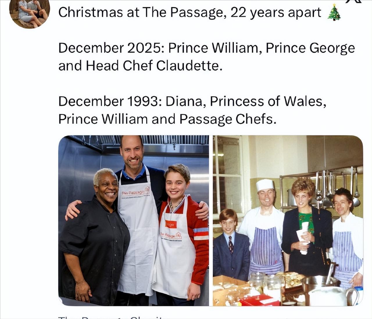 威廉王储也有不走心的时候啊,看到他晒出的这段话,实在让人忍不住替他尴尬了! 12月20日,威廉王储带着长子乔治王子一起参加了一场圣诞慈善活动,父子俩一起向大家展示厨艺,亲子同欢,画面温馨。 回家后,威廉王储在公众号上晒出了自己和儿子乔治的活动照时,还晒出了一张他的在1993年和母亲戴安娜王妃一起参加类似活动时的照片。 父子俩,母子俩,传递了一种对母亲的怀念,让人很感动,但是看到那附言,实在让我忍不住笑喷了。 1993年和戴安娜王妃参加活动,2025年和儿子乔治王子一起参加活动,这之间不是应该间隔了32年吗? 为什么在威廉王子的文章中却变成了22年呢? 都说威廉王子的数学不好,这是不走心,还是被实锤了?