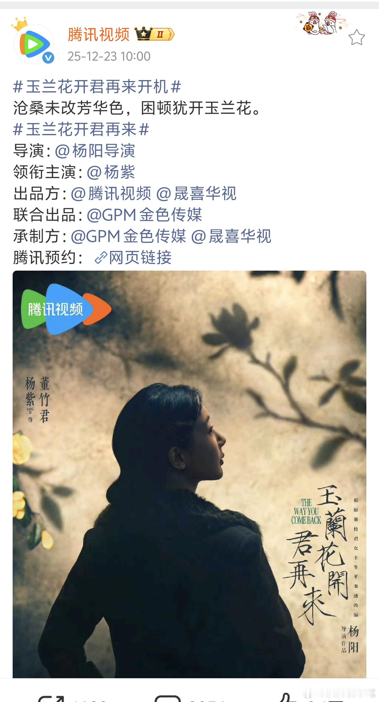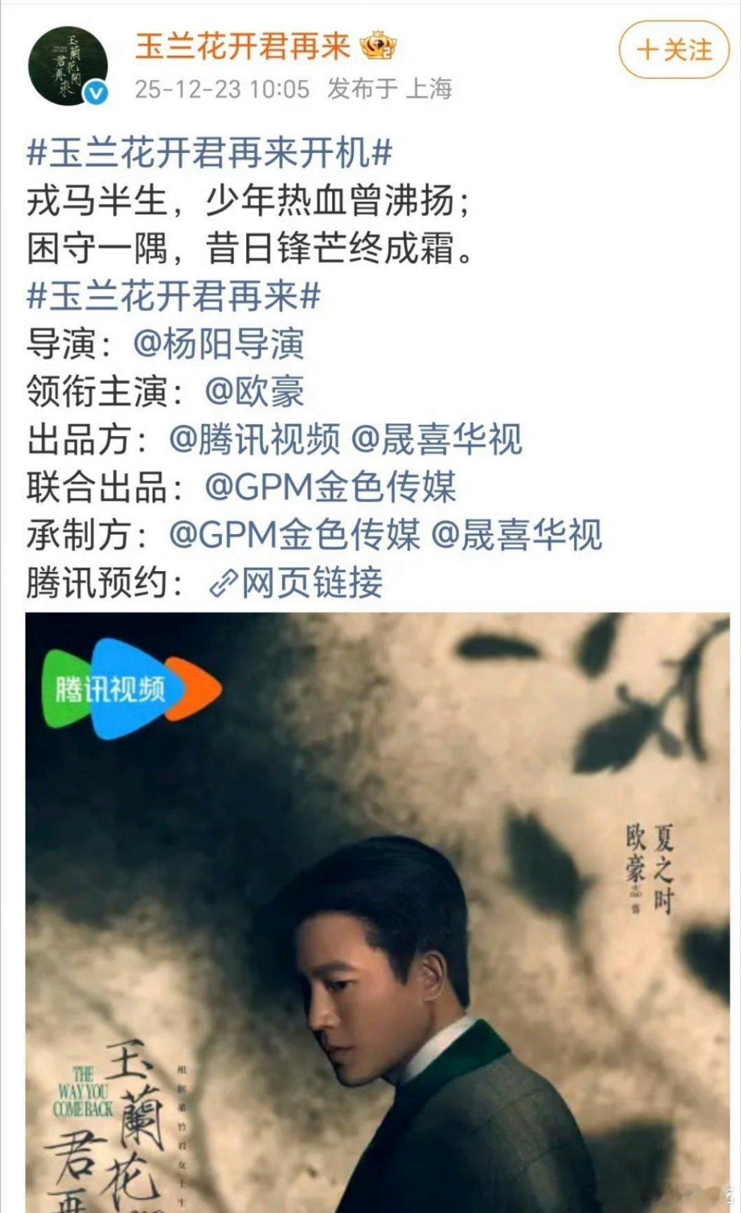 杨紫玉兰花开君再来开机,男主欧豪~欧豪快成我们流量花转型路上御用男主了,从幂丽到