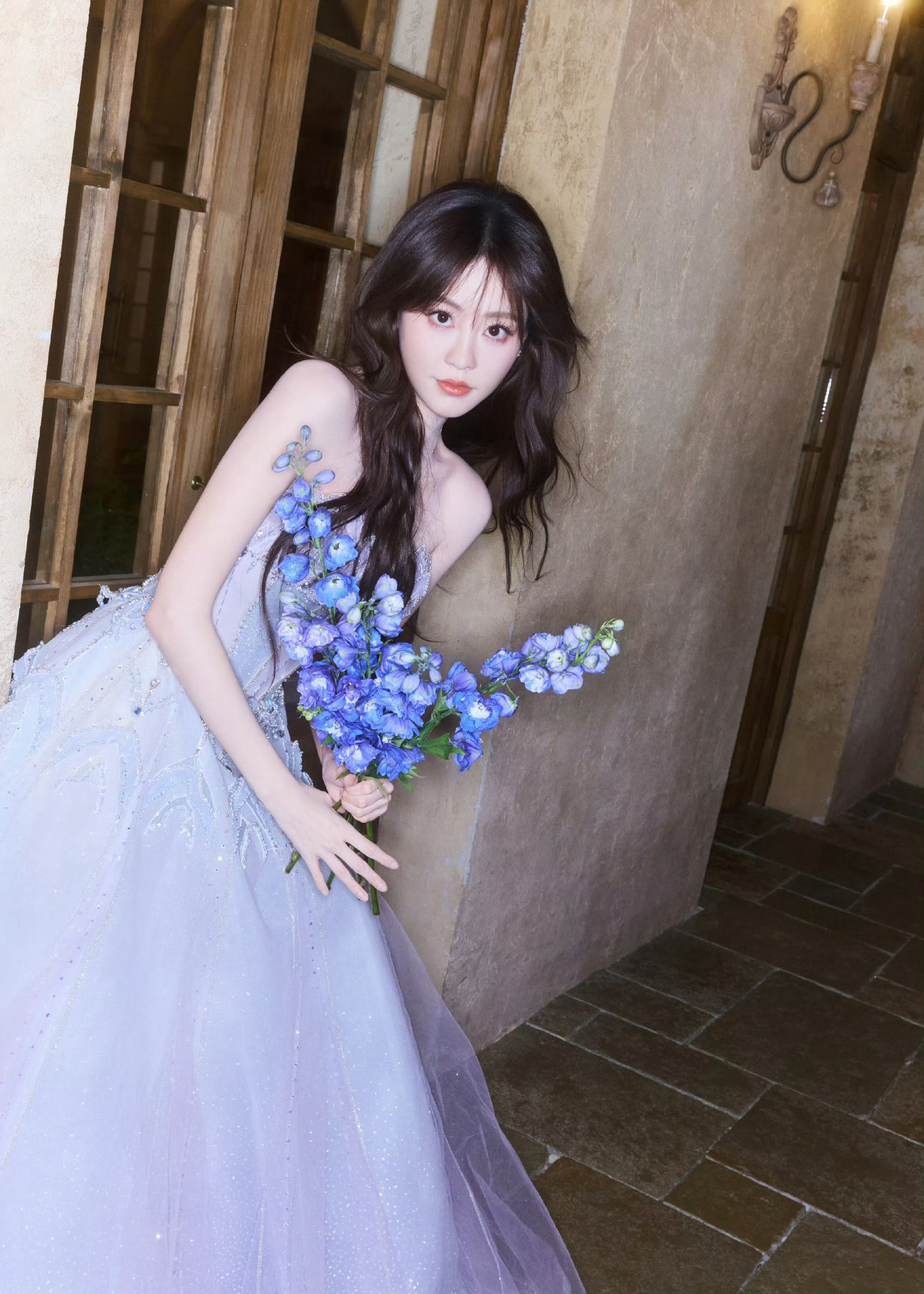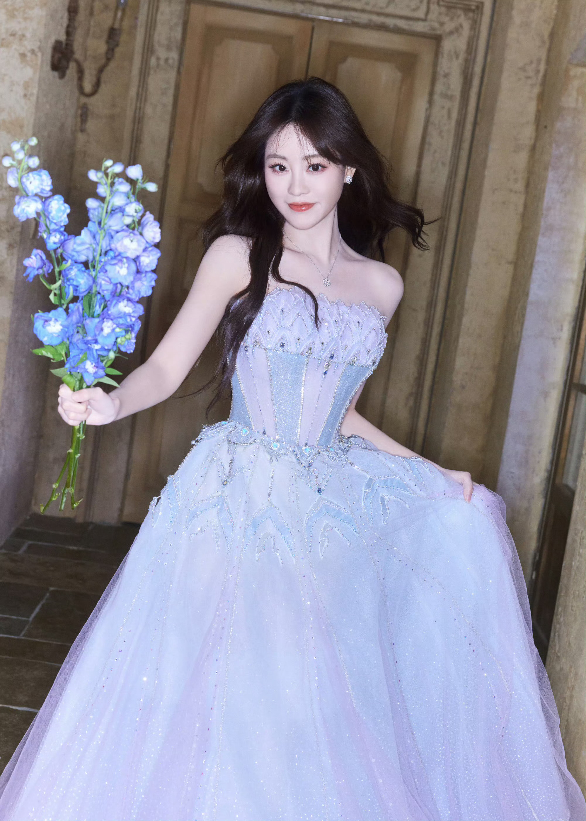 刘亦菲这一身衣服太丑了,用花挡住了才觉得好一点,全靠脸撑着