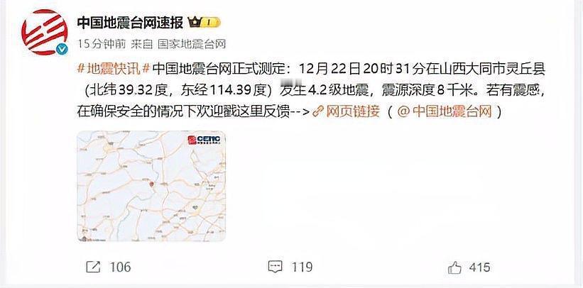 山西大同灵丘县近日发生4.2级地震 2025年12月22日晚,山西大同灵丘县发生4.2级地震,震源深度8公里,震中位于北纬39.32度,东经114.39度。 地震不仅让灵丘县及其周边地区感受到明显震感,还波及到河北、北京、天津等省市。当地村民描述称,房屋晃动时间短暂,约一两秒,窗台上花盆被震落。灵丘县红石塄乡和上寨镇政府工作人员表示,虽然感到明显晃动,但暂无财产损失报告。 地震发生后,中国地震局迅速启动四级应急服务响应,派遣专家前往震区评估情况。据中国地震台网统计,过去五年内,震中附近200公里范围内共发生多次地震,其中最大的一次发生在2022年10月3日,距离本次震中122公里处。目前,地震局正加强对该地区的监测和趋势研判,确保公众安全。