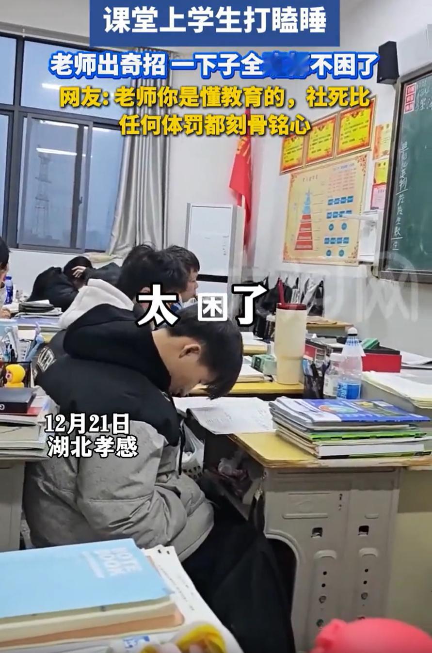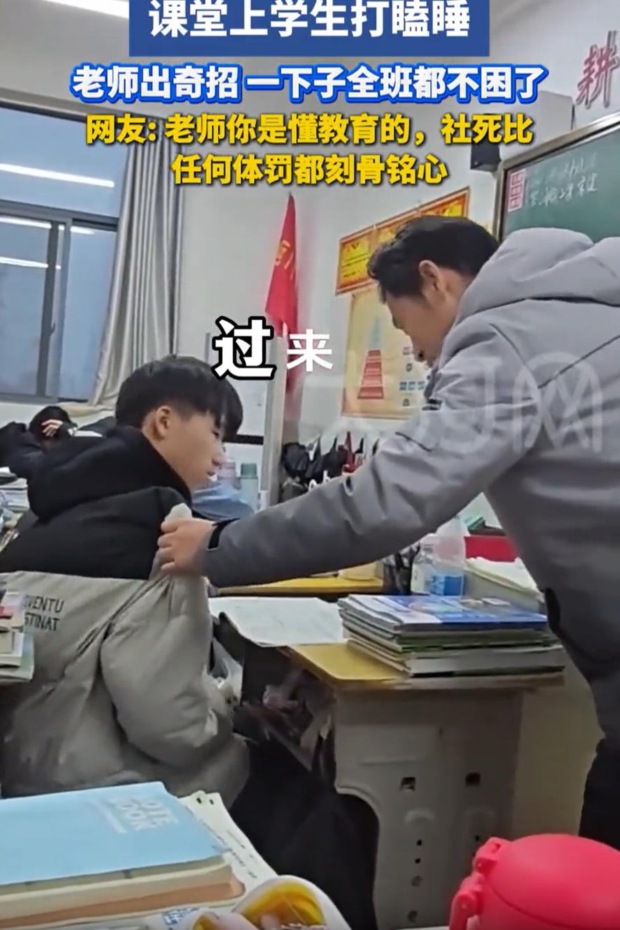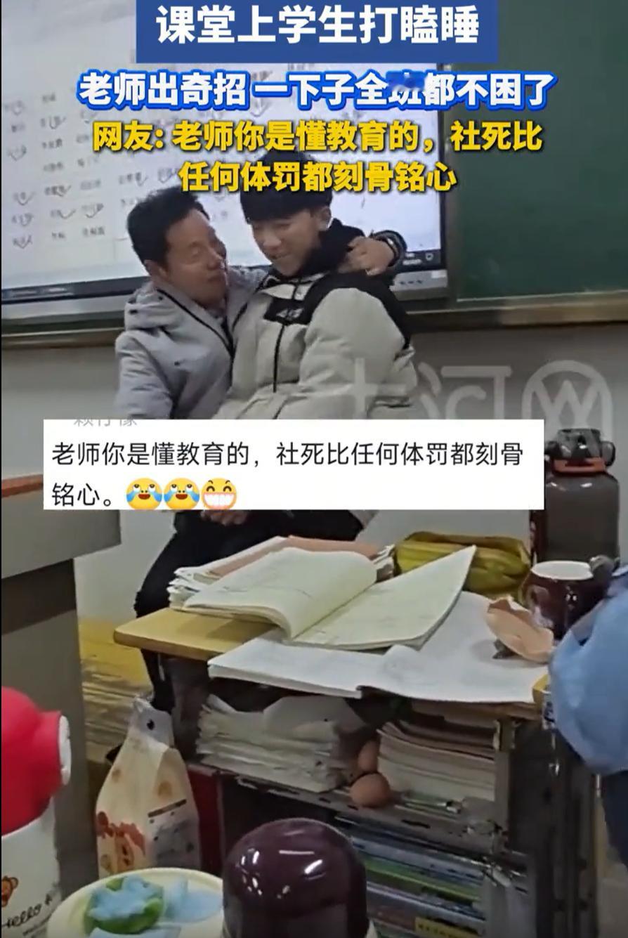 湖北孝感,一高中班级上早自习,坐在第一排的男生在课堂上太困,就直接坐着睡着了,老师看到后,突然想出一个让男生“社死”的方法,直接让他坐在自己的腿上睡觉,这下不仅男生困意全无,就连全班同学都跟着一起精神了 视频中,男生穿着棉袄坐在第一排,实在太困了,甚至坐着就低头睡着了,老师看到后并没有指责,反而是上前拍了拍男生的胳膊,然后给他拉到了讲台上 男生迷迷糊糊还以为老师要让他罚站,结果老师却突然坐在椅子上,然后抱着男生让他往自己的腿上坐,本来男生还迷迷糊糊的,但听到同学们一片哄笑声,自己也是立刻红了脸,一点困意都没有了 有网友说:第一排还睡觉,而且被老师抓,看来实力不允许,我当初上高中时就坐第一排,一上数学课时就睡觉,老师从来不管,因为有实力! 还有网友表示:这个老师是懂教育的,比起说教,这种“社死”更能让他刻骨铭心 这种说法我还是很赞同的,比起传统的惩戒方式,这位老师选择了一种不伤自尊却效果显著的方法。他没有当众斥责,没有罚站罚抄,而是用一个出乎意料的举动,既唤醒了学生,又活跃了课堂气氛 教育的方式有很多种,严厉的管教是一种,温和的引导也是一种。他知道,这些每天学习到深夜的孩子们,困意袭来有时真的难以抵挡。他的目的不是惩罚,而是用一种让他们印象深刻的方式,提醒他们课堂时间的重要性 在学习这件事上,清醒的不只是眼睛,还有心态。能让人笑着记住规矩的方式,本身就值得被记住 学生上课打瞌睡 老师出奇招