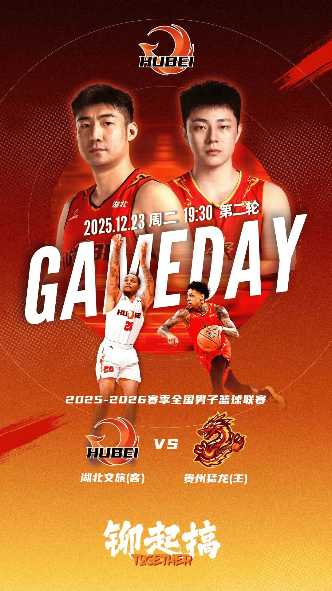 虎扑12月23日讯据湖北文旅男篮官方发文,北京时间2025年12月23日19:30,2025-2026赛季NBL联赛常规赛第二轮继续进行,湖北文旅男篮开赛三连客第二场,迎战联赛新军贵州猛龙。