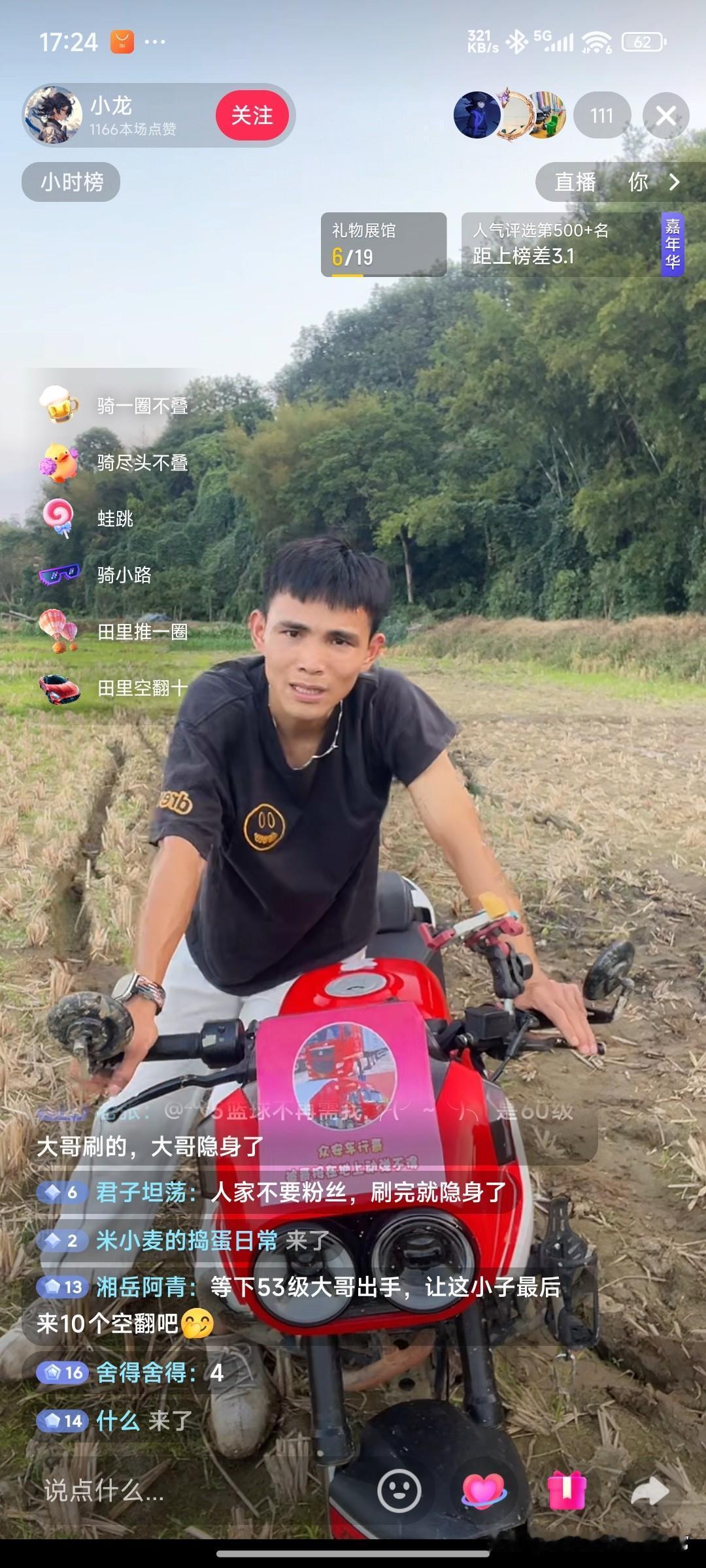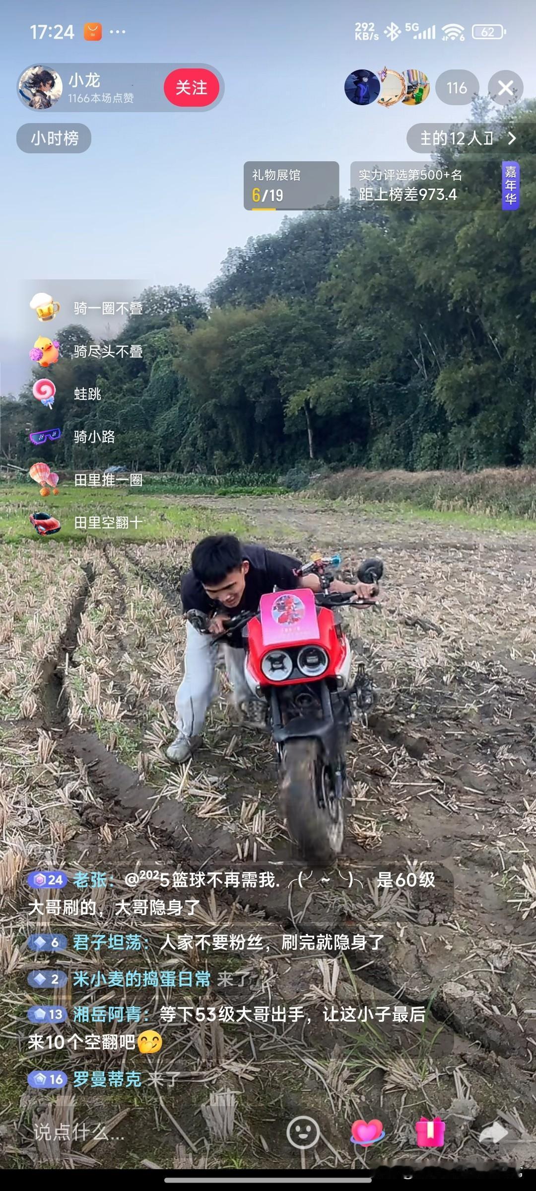 直播界又整新活!主播稻田里推摩托,大哥刷礼物点单太会玩 真没想到直播的花样能卷到这份上!主播小龙直接把直播间搬到泥田里,别人直播唱歌跳舞,他搁这儿跟一辆红色摩托车“死磕”,推得满头大汗还不撒手。 弹幕里大哥们更是玩嗨了,刷礼物点单各种奇葩要求:“骑一圈不叠”“田里空翻十”“蛙跳”,60级大哥隐身刷礼物,还有人等着53级大哥出手让主播来十个空翻。主播一边吭哧吭哧推摩托,一边回应粉丝要求,画面又滑稽又魔性。 现在的户外直播真是越来越没边界了,为了博眼球连泥田都成了直播间。有人觉得这种直播接地气、乐子多,也有人说纯属博眼球没营养。 你们觉得这种另类直播该不该火?是创意还是低俗?